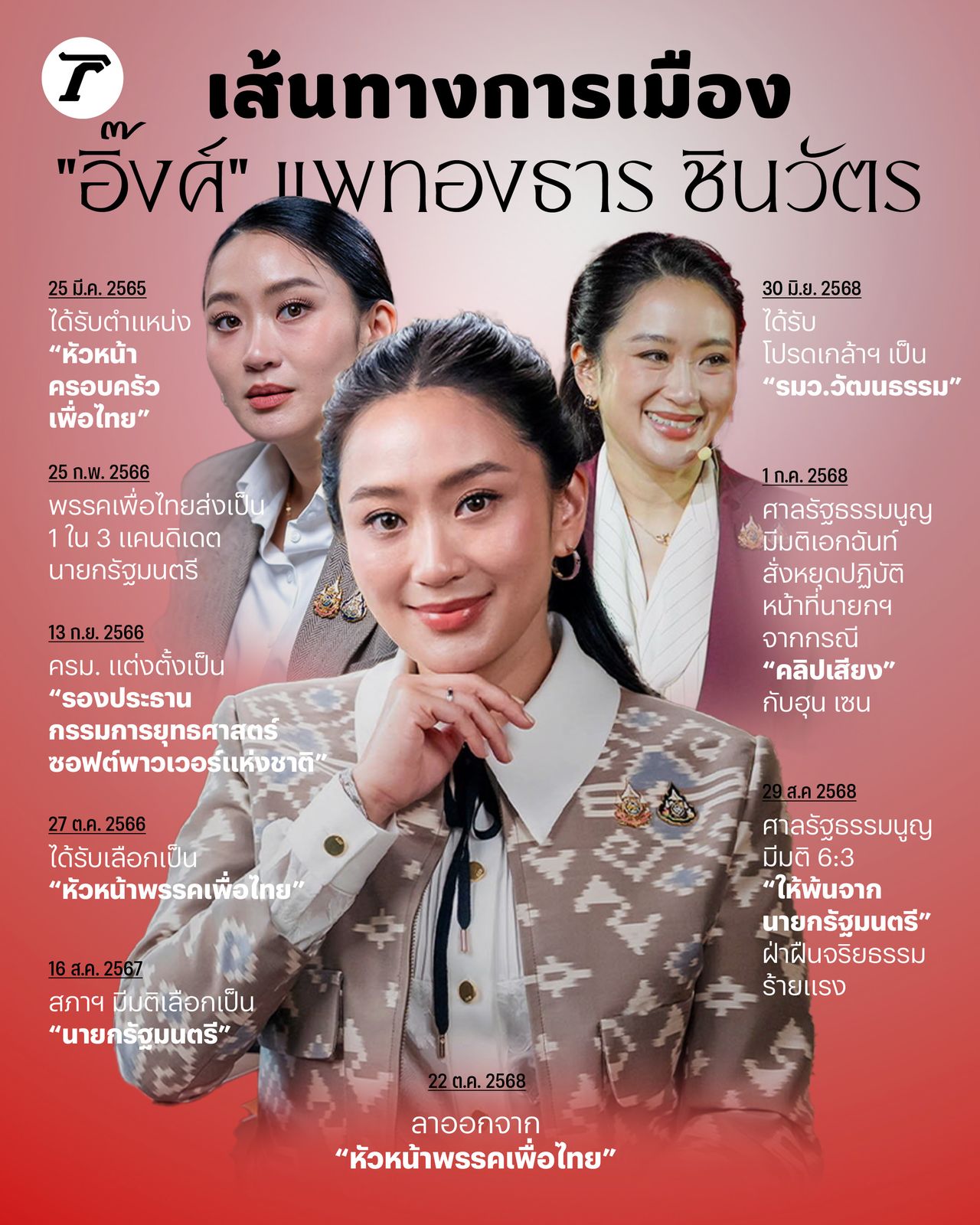 "อิ๊งค์" แพทองธาร ชินวัตร ลูกสาวอดีตนายกฯ ทักษิณ ศูนย์รวมจิตใจคนเสื้อแดง เพิ่งพ้นจากเก้าอี้นายกฯ จากคำวินิจฉัยศาล รธน. ล่าสุด ลาออกจากหัวหน้าพรรคอีก เธอผ่านอะไรมาบ้างในเวทีการเมือง ตั้งแต่ปี 2565-2568