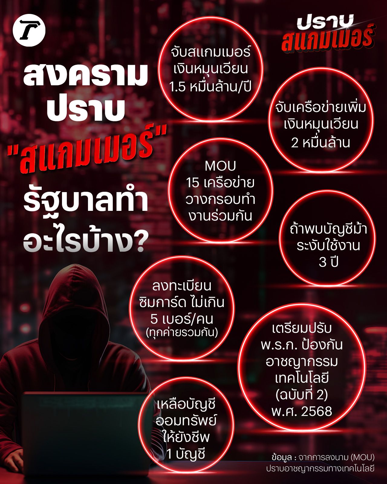 สงครามปราบ “สแกมเมอร์” รัฐบาลทำอะไรบ้าง? หลังการเข้ามาของรัฐบาลใหม่ภายใต้การนำของนายกฯ อนุทิน ชาญวีรกูล นโยบายการปราบสแกมเมอร์ กลายเป็นวาระแห่งชาติ ถูกผลักดันให้มีความร่วมมือกันของหน่วยงานรัฐผ่าน MOU ซึ่งสุดท้ายแล้วต้องจับตาว่า กรอบที่วางไว้จะทำได้สำเร็จหรือไม่