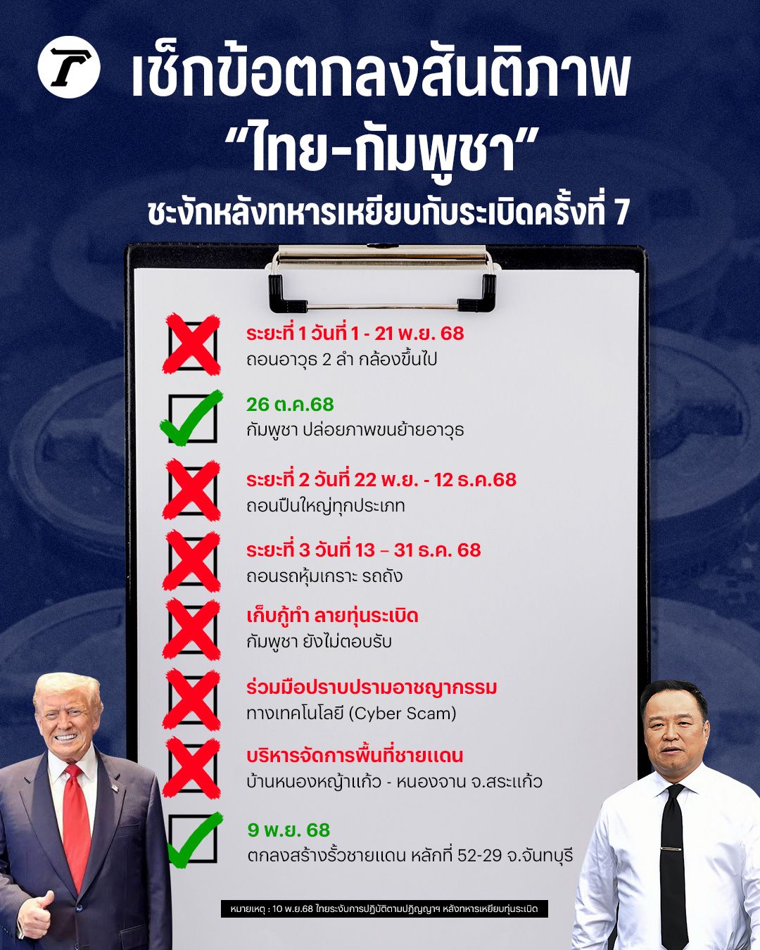 เช็กข้อตกลงสันติภาพ “ไทย-กัมพูชา” ชะงักหลังทหารเหยียบระเบิดครั้งที่ 7 ที่ผ่านมามีการดำเนินการถอนอาวุธหนักในระยะที่ 1 โดยฝั่งกัมพูชา ได้ทำการปล่อยภาพการขนย้ายอาวุธ แต่ก็ยังมีข้อกังขาจากฝั่งไทย เพราะบางเงื่อนไขในข้อตกลง กัมพูชา กลับไม่มีท่าทีในการดำเนินการเช่น ความร่วมมือปราบปรามอาชญากรรมทางเทคโนโลยี