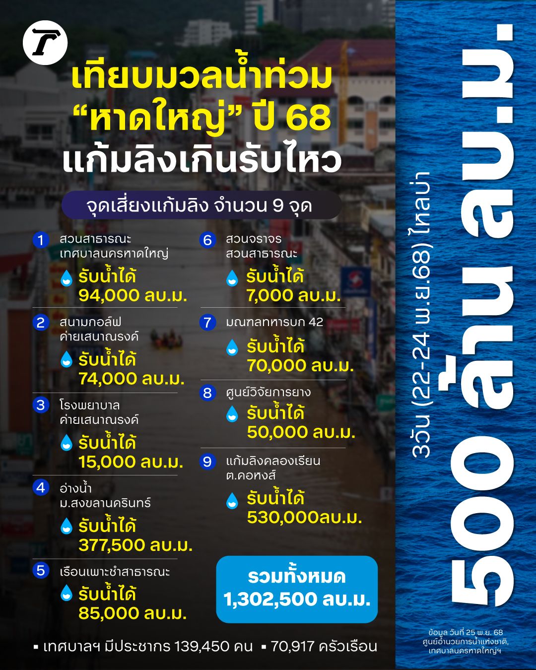 เปิดสถิติเพียง 3 วัน มีน้ำไหลบ่าเข้าเมืองหาดใหญ่กว่า 500 ล้าน ลบ.ม. พบแผนรับมือน้ำท่วม เทศบาลฯ ปี 2568 จุดรับน้ำแก้มลิง 9 แห่ง ไม่สามารถรับน้ำไหว บวกกับฝนที่ตกแช่นานทำให้เกิดน้ำท่วมหนักสุดในรอบ 30 ปี อย่างที่ใครไม่อาจคาดคิด ขณะที่ประชาชนในพื้นที่อีกหลายชีวิตยังรอคอยความช่วยเหลือ