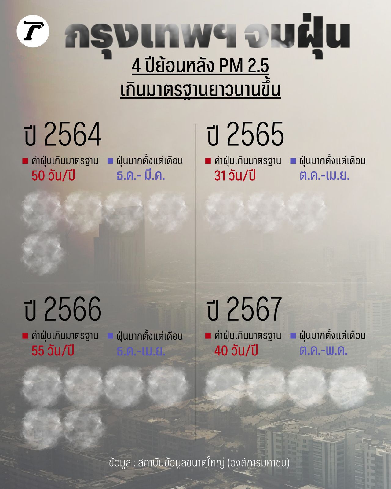 กรุงเทพฯ จมฝุ่นเปิดสถิติ 4 ปีย้อนหลัง PM 2.5 เกินมาตรฐานยาวนานขึ้น เฉลี่ย 31 – 50 วันต่อปี สะท้อนภาพมลพิษทางอากาศที่ส่งผลกระทบต่อคนเมือง แม้จะมีการเตรียมความพร้อมล่วงหน้าก็ตาม