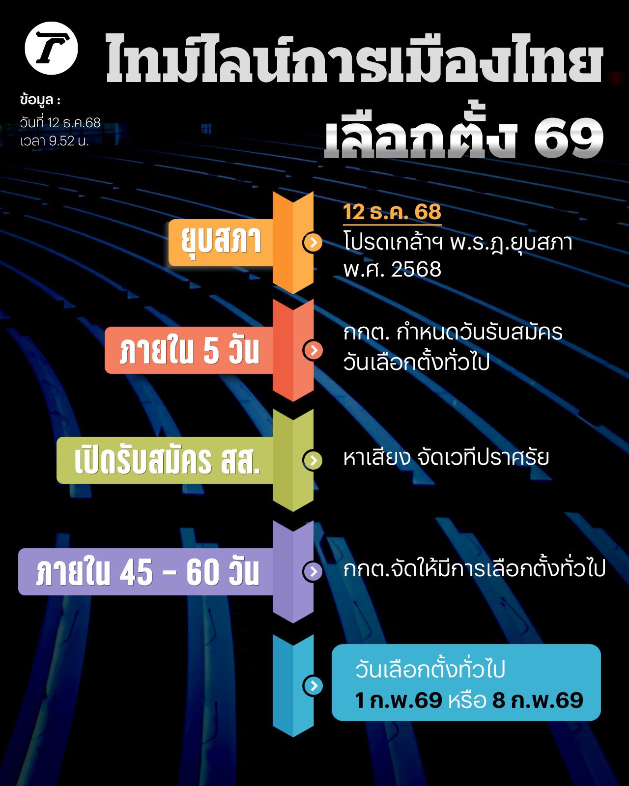 ไทม์ไลน์การเมืองไทย เลือกตั้ง 2569 ท่ามกลางวิกฤตความมั่นคงด้านชายแดนกัมพูชา หลังเช้านี้ (12 ธ.ค.68)โปรดเกล้าฯ พ.ร.ฎ.ยุบสภา พ.ศ. 2568 ซึ่งจะมีการเลือกตั้งหลังจากนี้ภายใน 45 – 60 วัน โดยคาดว่าจะมีการเลือกตั้งวันที่ 1 ก.พ.69 หรือ 8 ก.พ.69