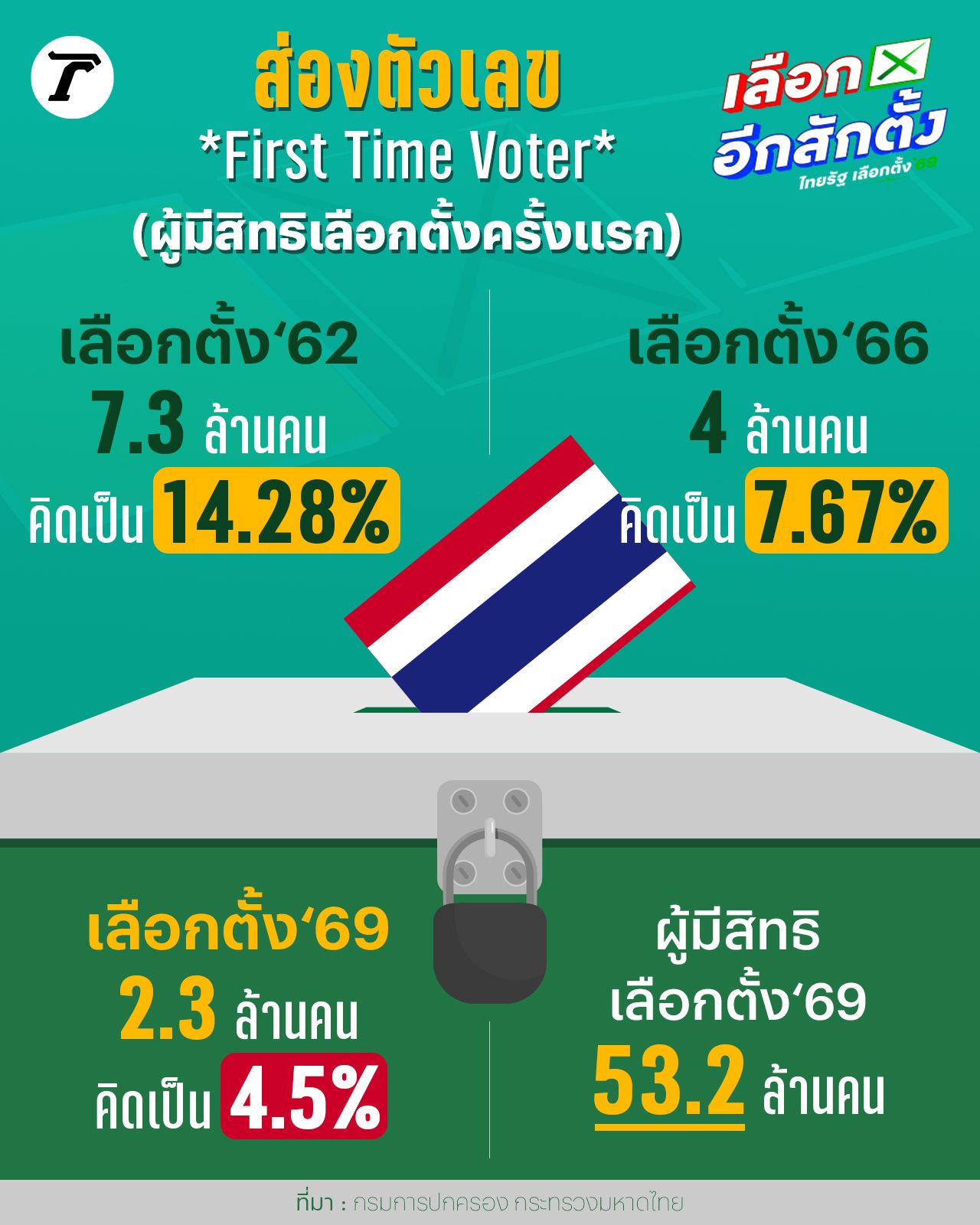 แม้ตัวเลขสถิติจากกรมการปกครองจะระบุชัดเจนว่า ในการเลือกตั้งปี 2569 นี้ มีจำนวน First Time Voter อยู่ที่ประมาณ 2.3 ล้านคน คิดเป็นสัดส่วนเพียง 4.5% ของผู้มีสิทธิเลือกตั้งทั้งหมด ซึ่งถือเป็นตัวเลขที่ "ลดน้อยถอยลง" เมื่อเทียบกับมหกรรมการเลือกตั้งใหญ่ 2 ครั้งก่อนหน้า จากโครงสร้างประชากรไทยที่เข้าสู่สังคมสูงวัยอย่างสมบูรณ์