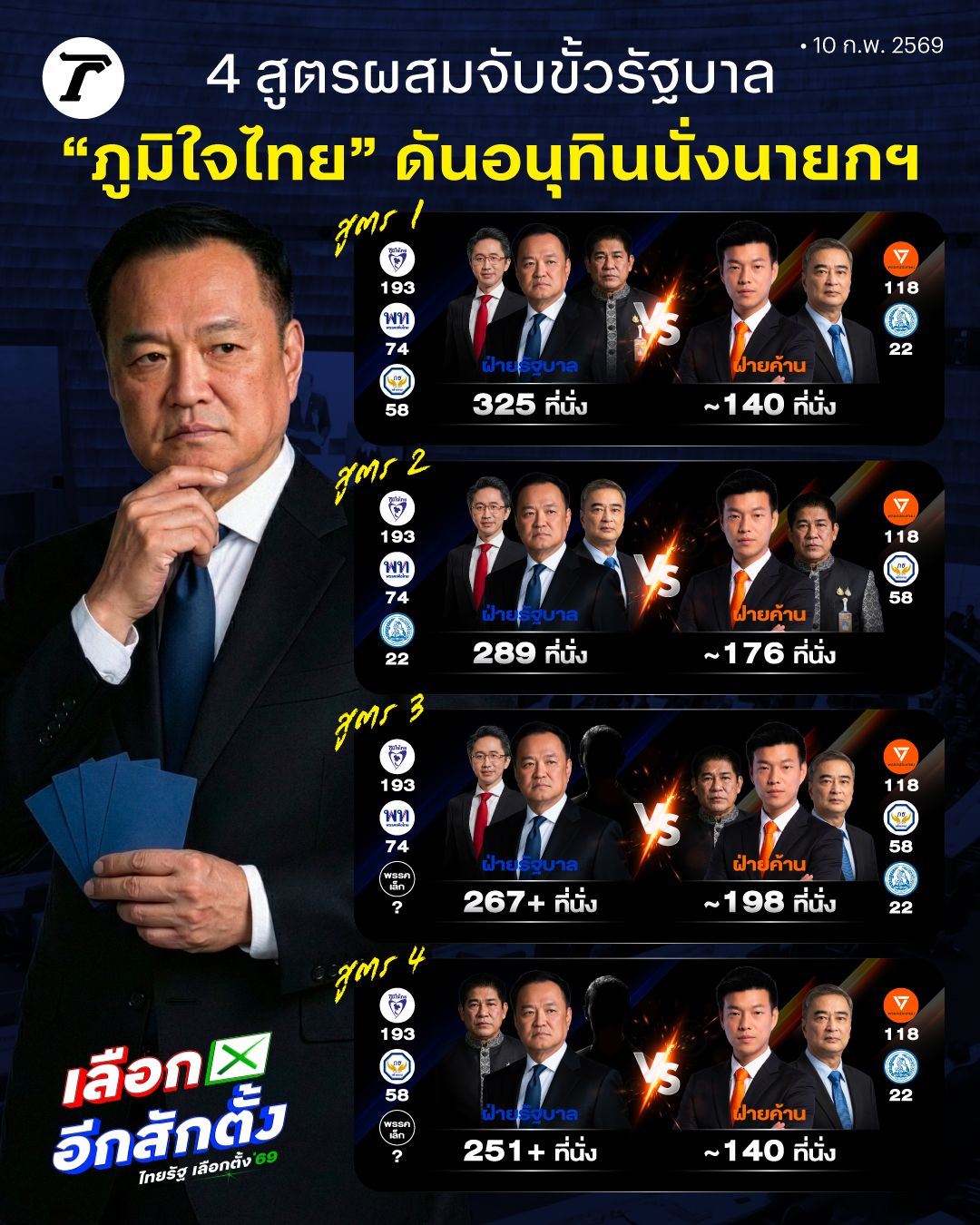 ภูมิใจไทย (193) เพื่อไทย (74) กล้าธรรม (58) = 325 ที่นั่ง