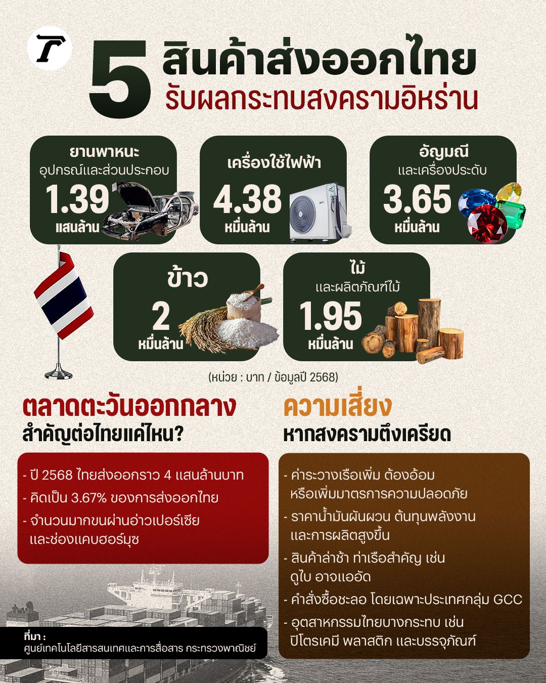 ความขัดแย้งในภูมิภาคตะวันออกกลาง ระหว่างสหรัฐฯ และอิสราเอล กับอิหร่าน กำลังสั่นคลอนเส้นทางการค้าสำคัญของโลก เมื่อการขนส่งผ่านอ่าวเปอร์เซียเผชิญความไม่แน่นอน ส่งผลให้ 5 อันดับสินค้าส่งออกหลักของไทย เสี่ยงได้รับผลกระทบจากต้นทุนขนส่งที่เพิ่มขึ้นและการชะลอตัวของตลาดตะวันออกกลาง