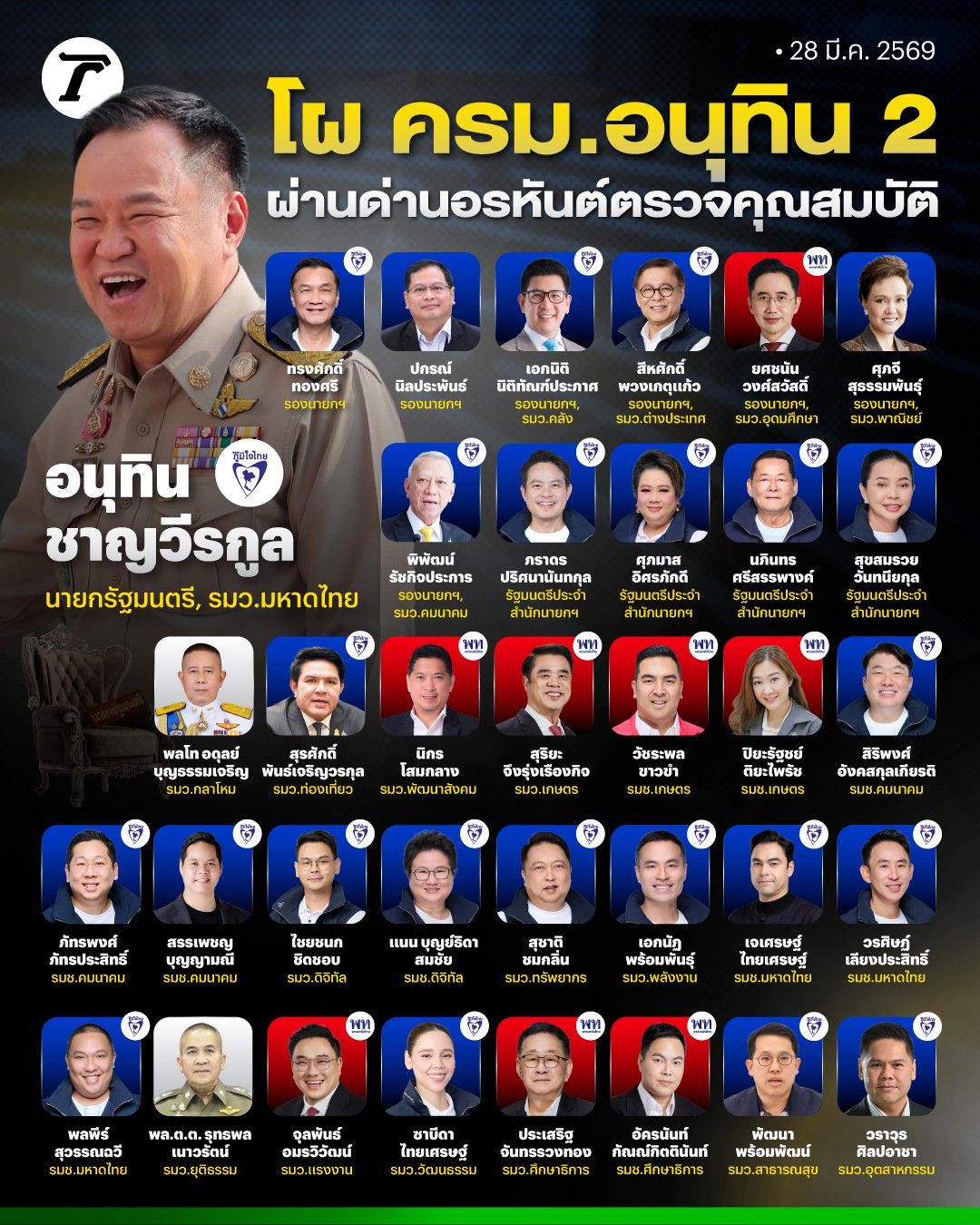 อัปเดตโผ ครม.อนุทิน 2 เตรียมทูลเกล้าฯ 30 มี.ค.นี้ หลัง 35 รายชื่อ ผ่านด่านอรหันต์ตรวจเข้มคุณสมบัติ เพื่อไทยส่ง 3 ชื่อ “นิกร” เสียบ “สุดาวรรณ” ขณะที่ “เดียร์ ขัตติยา - วิสุทธิ์” วืดแรง