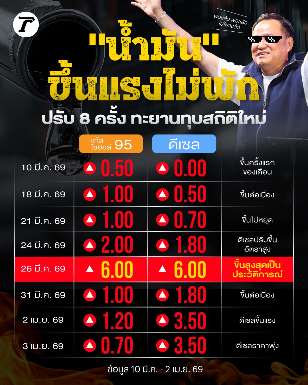 3 เม.ย.69 | +0.70 | +3.50 | ดีเซลราคาพุ่ง |