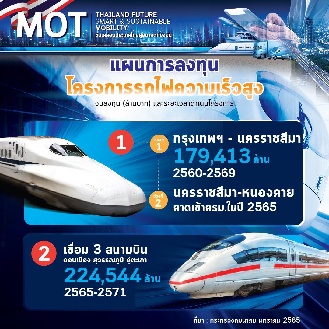 1.โครงการรถไฟความเร็วสูงไทย-จีน ช่วงที่ 1 กรุงเทพฯ-นครราชสีมา ระยะทาง 253 กิโลเมตร ความเร็วในการวิ่งรถสูงสุด 250 กิโลเมตรต่อชั่วโมง ซึ่งอยู่ระหว่างการก่อสร้าง งบประมาณ 179,412 ล้านบท จะแล้วเสร็จปี 2569