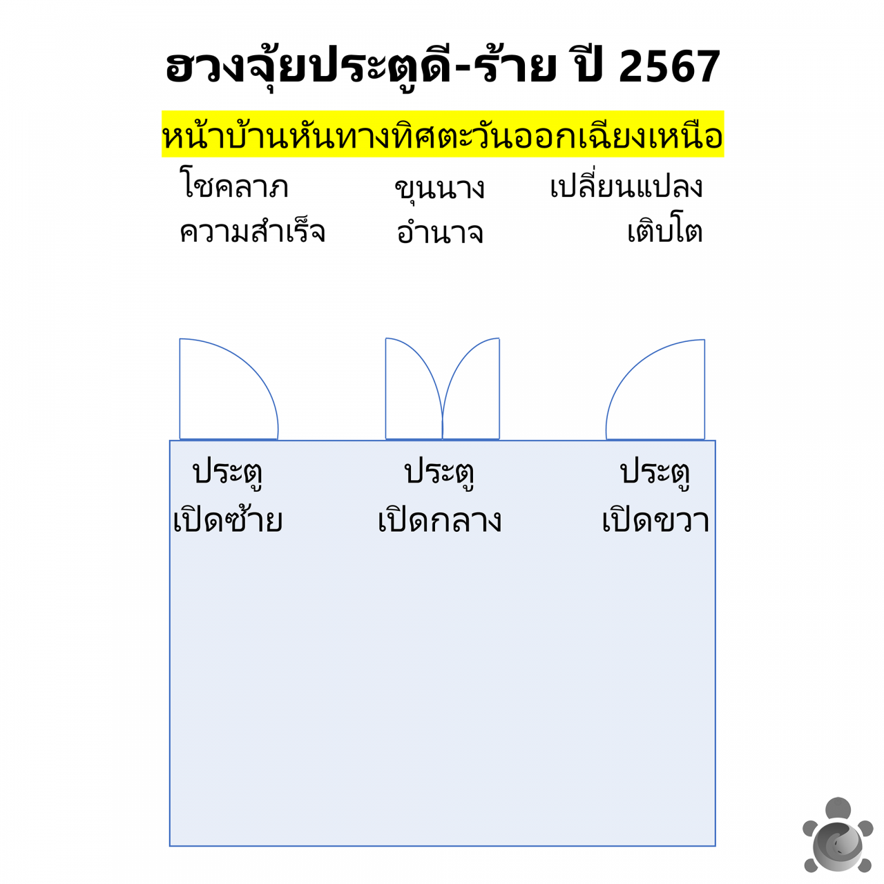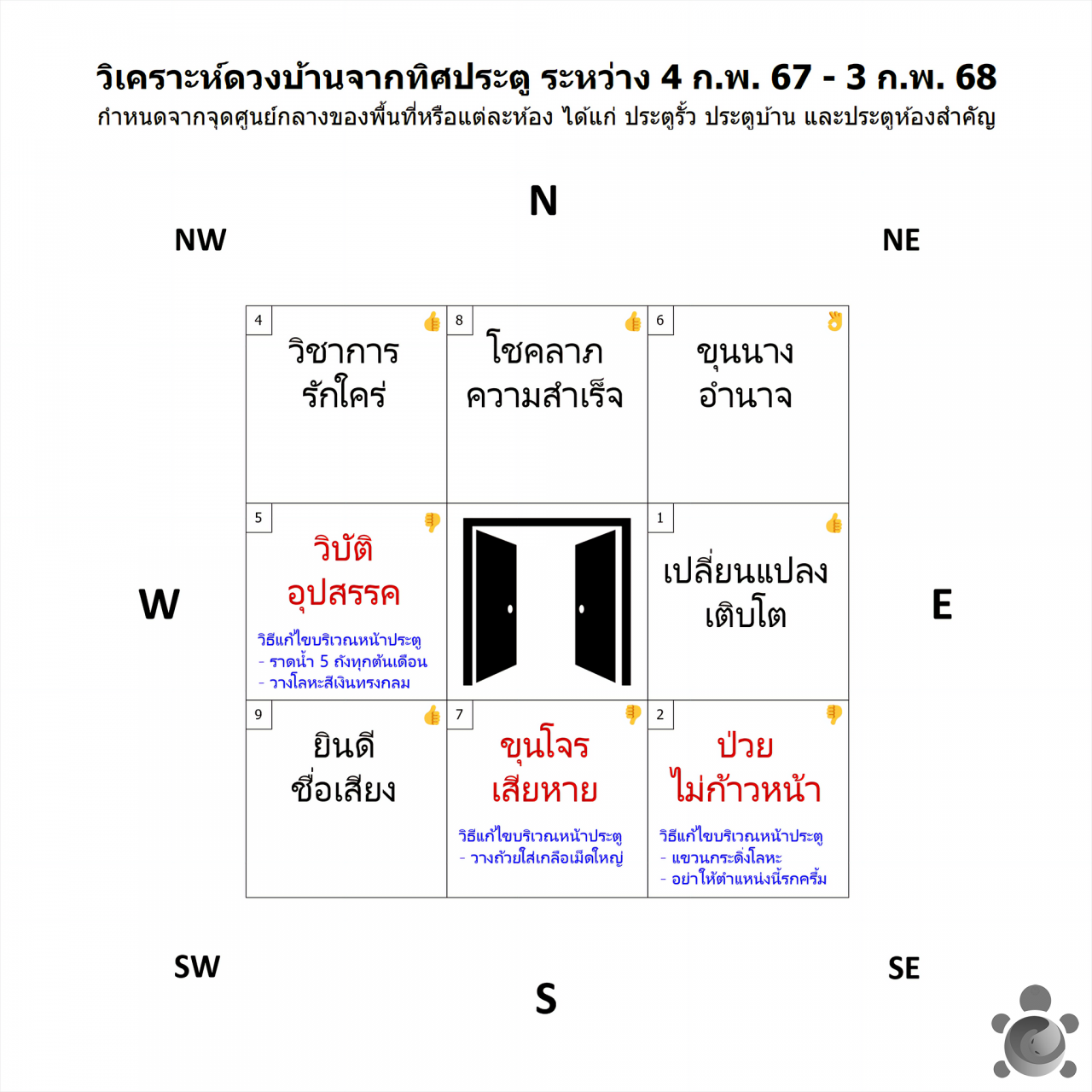 ซินแสโจ ที่ปรึกษาฮวงจุ้ย เพจ sinsae ประสบการณ์ 23 ปี กล่าวถึงทิศทางของบ้านที่ส่งเสริมให้ผู้อยู่อาศัยปี 2567 ว่า ปกติการดูทิศทางของบ้านจะมีการดูประจำทุกปี โดยดูจากประตูบ้าน ที่มีพลังชี่ไหลผ่านประตูเข้ามาภายในบ้านแต่ละทิศ ซึ่งปี 2567 สามารถสรุปได้ตามทิศทางการหันของประตูบ้านไปแต่ละทิศได้ดังนี้