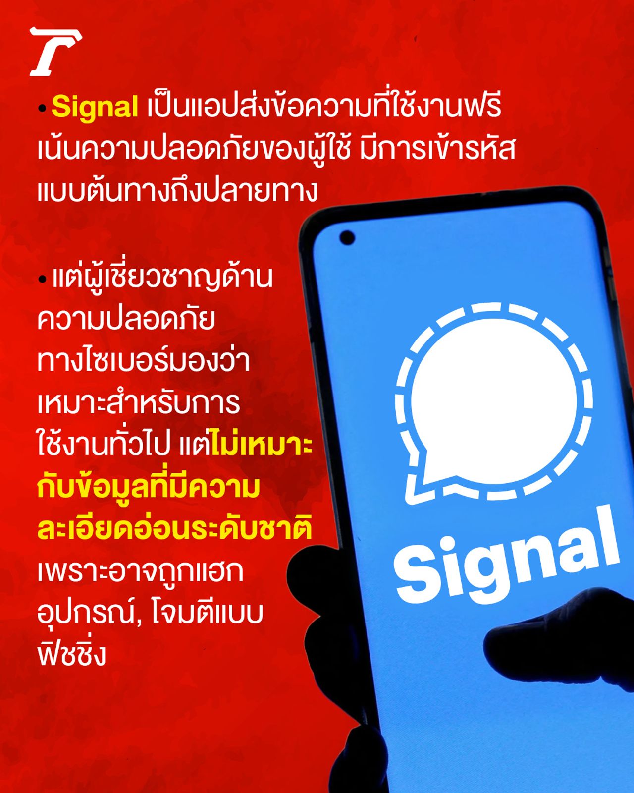 อย่างไรก็ดี ผู้เชี่ยวชาญด้านความปลอดภัยทางไซเบอร์มองว่า แม้ Signal จะมีความปลอดภัยมากกว่าแอปส่งข้อความอื่น ๆ แต่ก็ยังเหมาะแค่สำหรับการใช้งานทั่วไป ไม่เหมาะกับข้อมูลที่มีความละเอียดอ่อนระดับชาติ เพราะมีโอกาสที่อุปกรณ์จะถูกแฮก การโจมตีแบบฟิชชิ่ง ฯลฯ