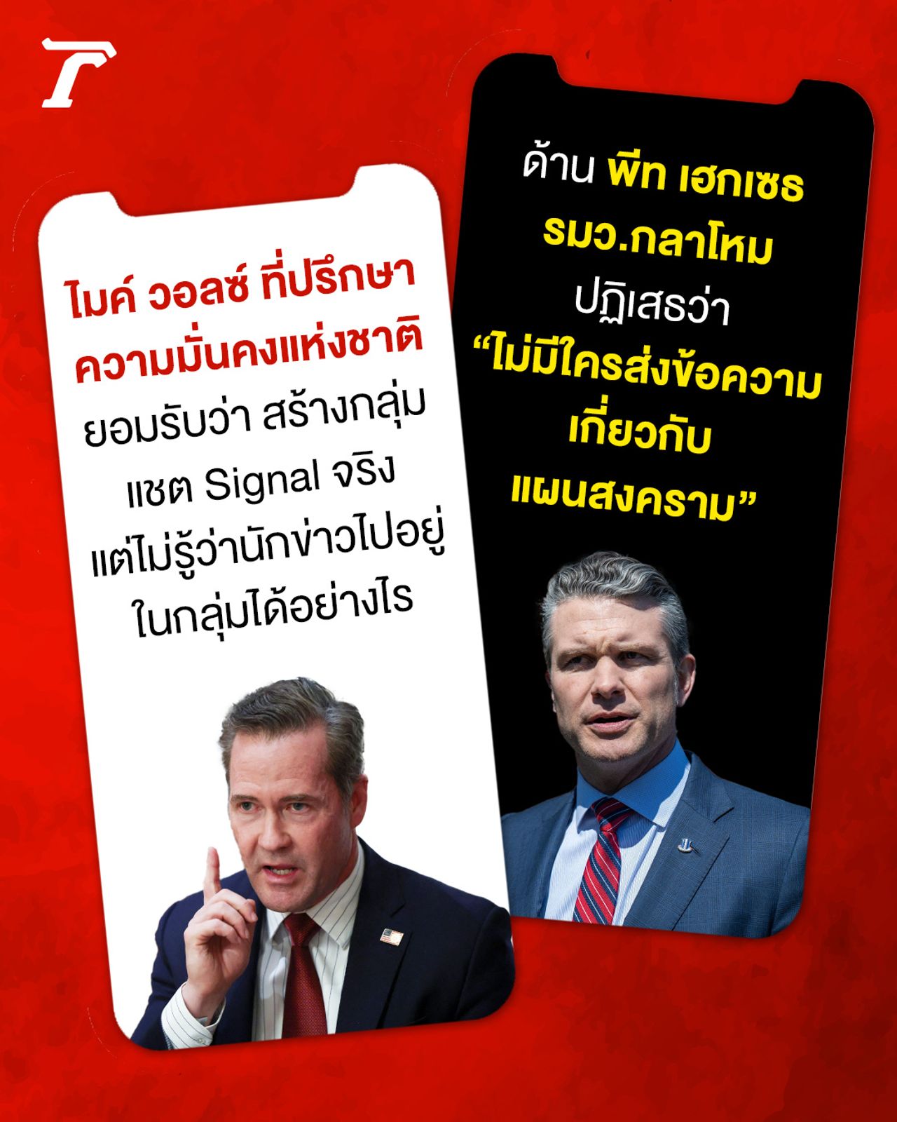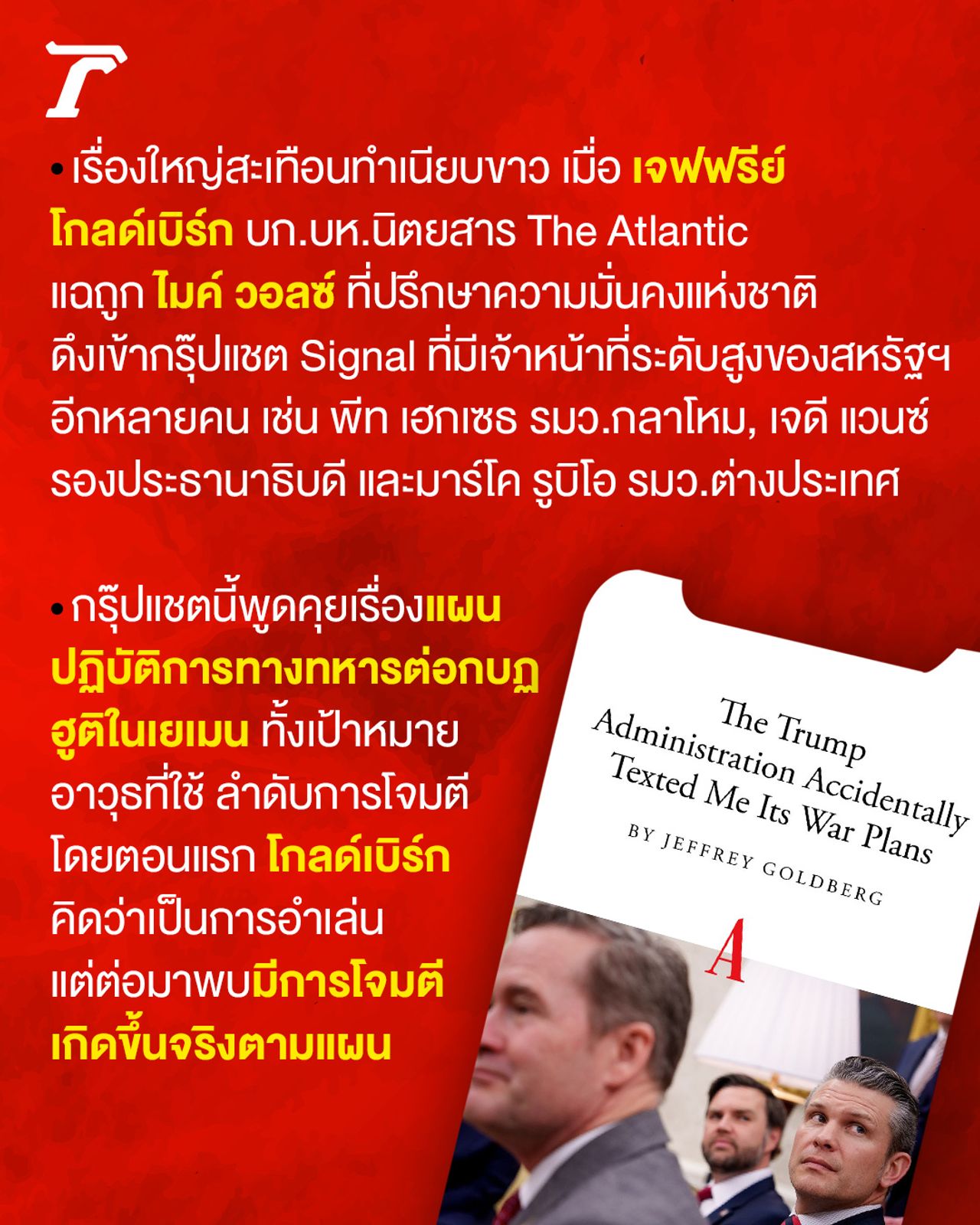 1. เรื่องนี้เริ่มต้นจากการที่ “เจฟฟรีย์ โกลด์เบิร์ก” บรรณาธิการบริหารของนิตยสาร The Atlantic เผยแพร่บทความชื่อว่า “The Trump Administration Accidentally Texted Me Its War Plans” หรือ “รัฐบาลทรัมป์เผลอส่งแผนสงครามมาให้ผมโดยบังเอิญ” โดยระบุว่า เมื่อวันที่ 11 มี.ค. ตนได้รับคำขอเชื่อมต่อในแอป Signal จากคนที่ชื่อ “ไมค์ วอลซ์” ซึ่งเป็นชื่อเดียวกับที่ปรึกษาความมั่นคงแห่งชาติ