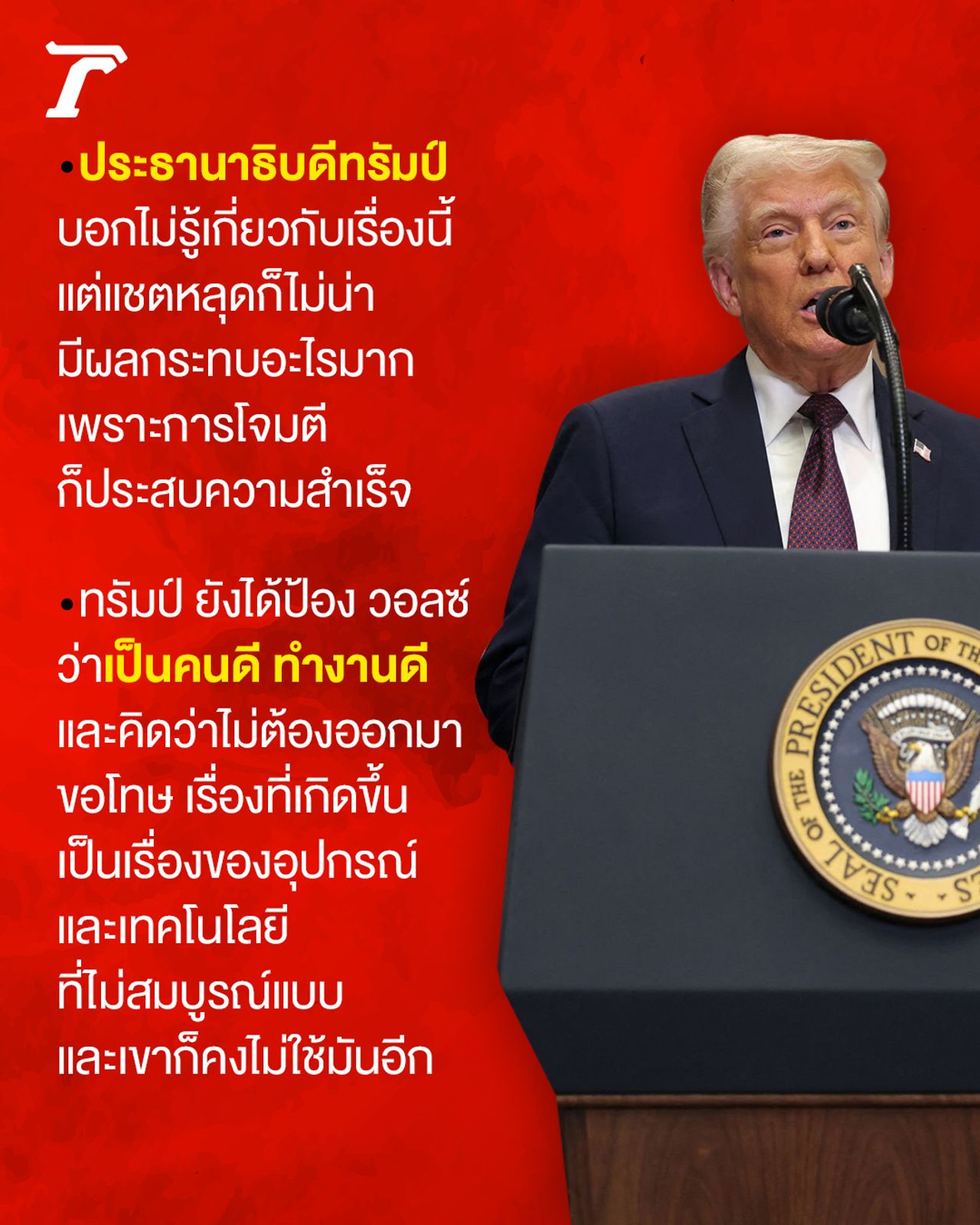 3.ผู้สื่อข่าวสอบถามเรื่องที่เกิดขึ้นกับประธานาธิบดีโดนัลด์ ทรัมป์ กล่าวว่า ไม่ทราบถึงกลุ่มแชตที่เกิดขึ้น แต่มองว่าไม่ใช่เรื่องใหญ่ แชตหลุดก็ไม่น่ามีผลกระทบอะไรมากเพราะการโจมตีก็ประสบความสำเร็จ