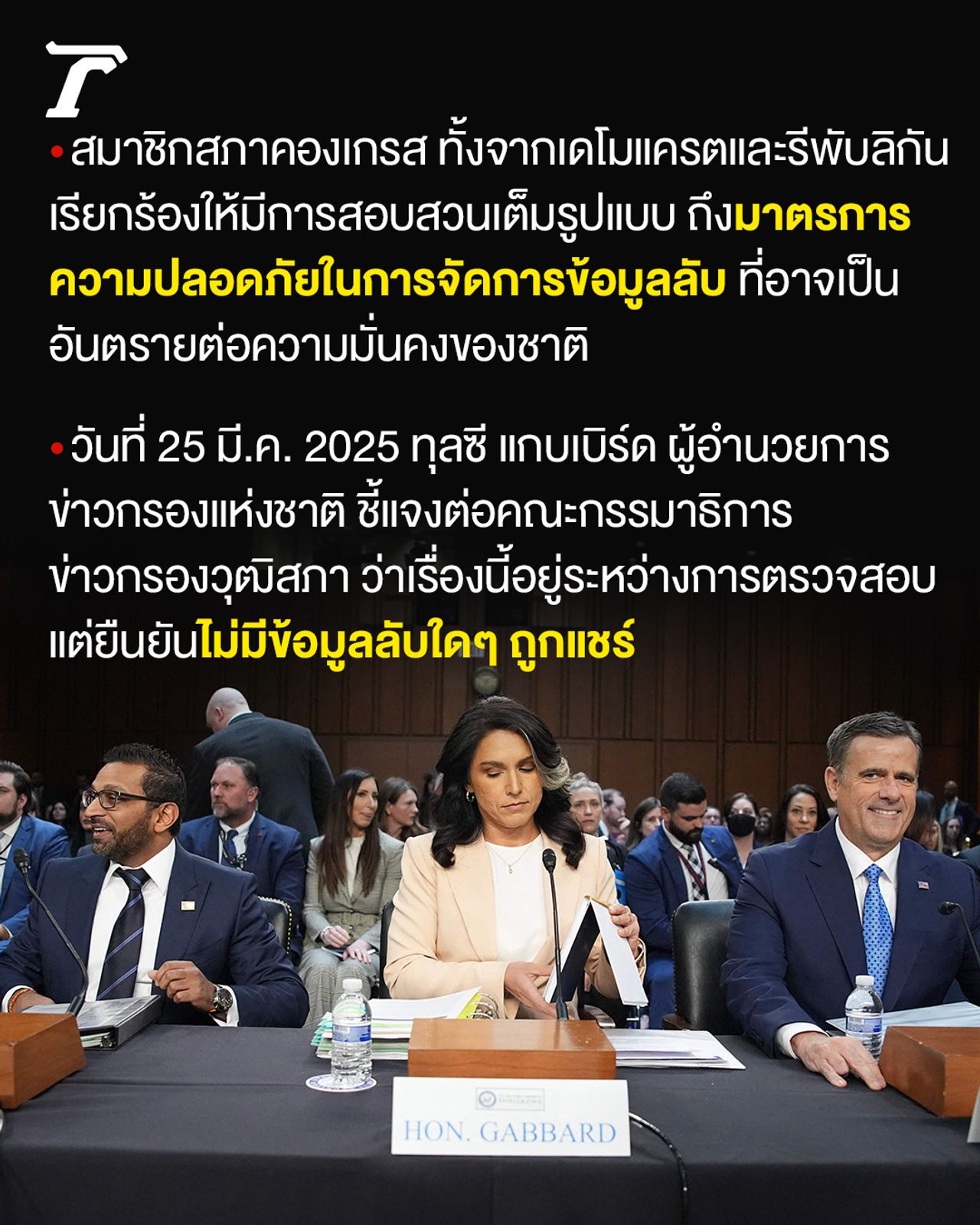 4.วันที่ 25 มี.ค. 2025 ในคณะกรรมาธิการข่าวกรองวุฒิสภา ได้ให้ ทุลซี แกบเบิร์ด ผู้อำนวยการข่าวกรองแห่งชาติ และ จอห์น แรดคลิฟฟ์ ผู้อำนวยการสำนักข่าวกรองกลาง (CIA) ซึ่งเป็น 2 คนที่อยู่ในกลุ่มแชตดังกล่าวชี้แจง