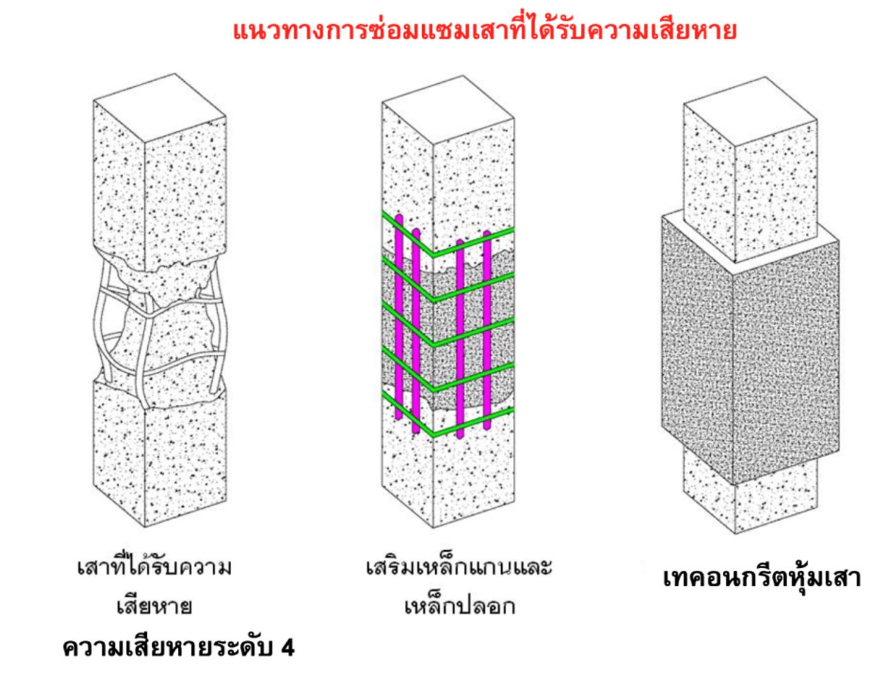 การซ่อมแซมเสาที่แตกหัก อาจซ่อมเสริมได้ แต่ถ้าเสียหายหนัก ไม่เสถียร เจ้าของอาคารกังวลว่าตึกจะพัง มีโอกาสที่น้ำหนักตัวข้างบนทำให้เอียงขยับ ต้องรีบซ่อมทันที