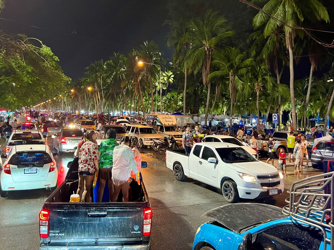 โดยส่วนใหญ่พบว่า เดินทางด้วยรถกระบะ บรรทุกคนมาเต็มท้ายรถ พร้อมกับถังน้ำ หรืออุปกรณ์เล่นน้ำ สังเกตป้ายทะเบียนรถพบว่ามาจากหลายจังหวัด อาทิ กรุงเทพมหานคร, ชลบุรี, ระยอง และสมุทรปราการ มุ่งหน้าเข้ามาทางถนนข้าวหลามเพื่อไปยังชายหาดบางแสน