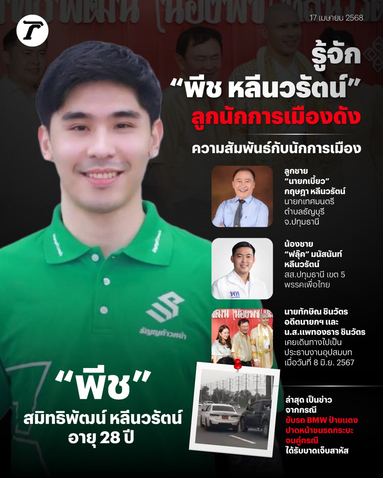 เปิดประวัติ พีช หลีนวรัตน์ ทายาทตระกูลการเมืองปทุมฯ คลิปดัง BMW ป้ายแดง โดย สมิทธิพัฒน์ หลีนวรัตน์ หรือ พีช อายุ 28 ปี เป็นลูกชายของ “นายกเบี้ยว” กฤษฎา หลีนวรัตน์ นายกเทศมนตรีตำบลธัญบุรี จ.ปทุมธานี และน้องชายของ “ฟลุ๊ค” มนัสนันท์ หลีนวรัตน์ สส.ปทุมธานี เขต 5 พรรคเพื่อไทย