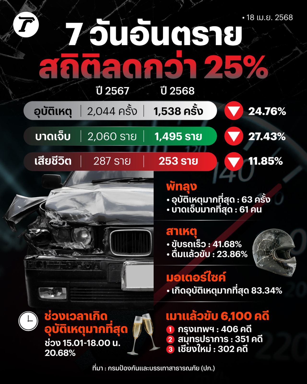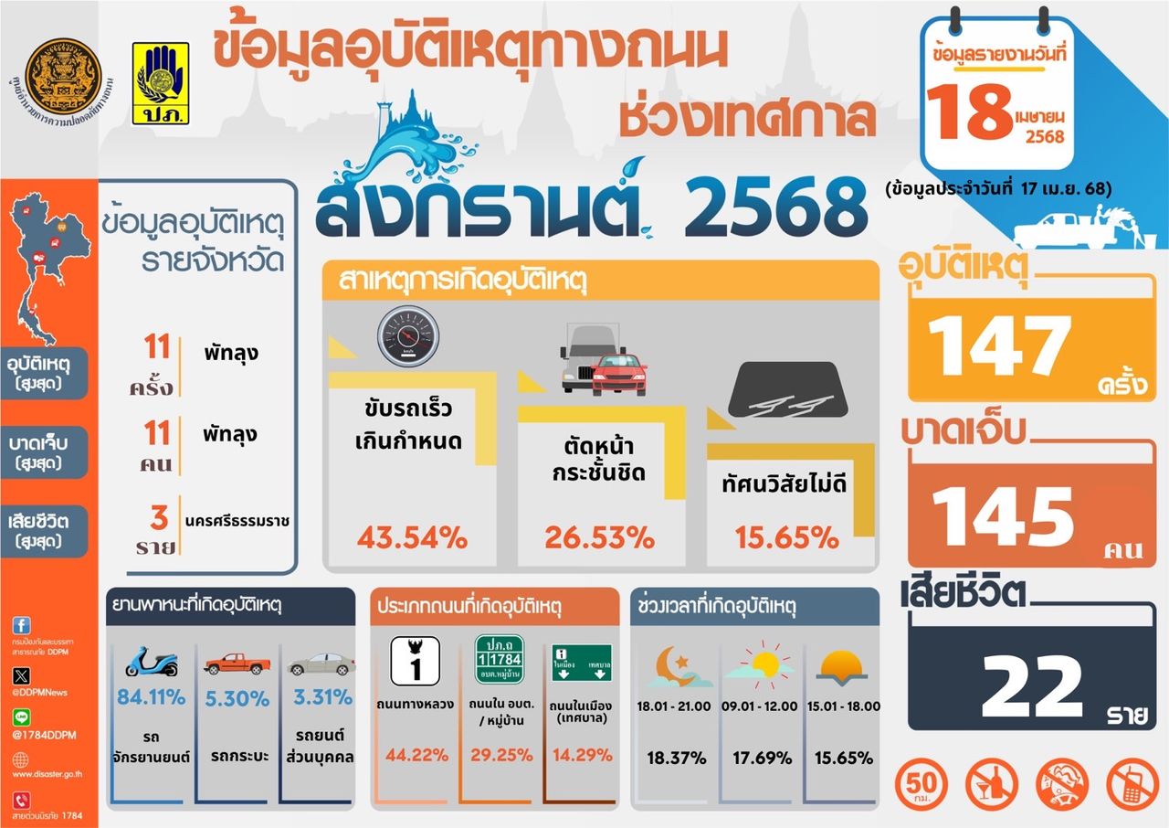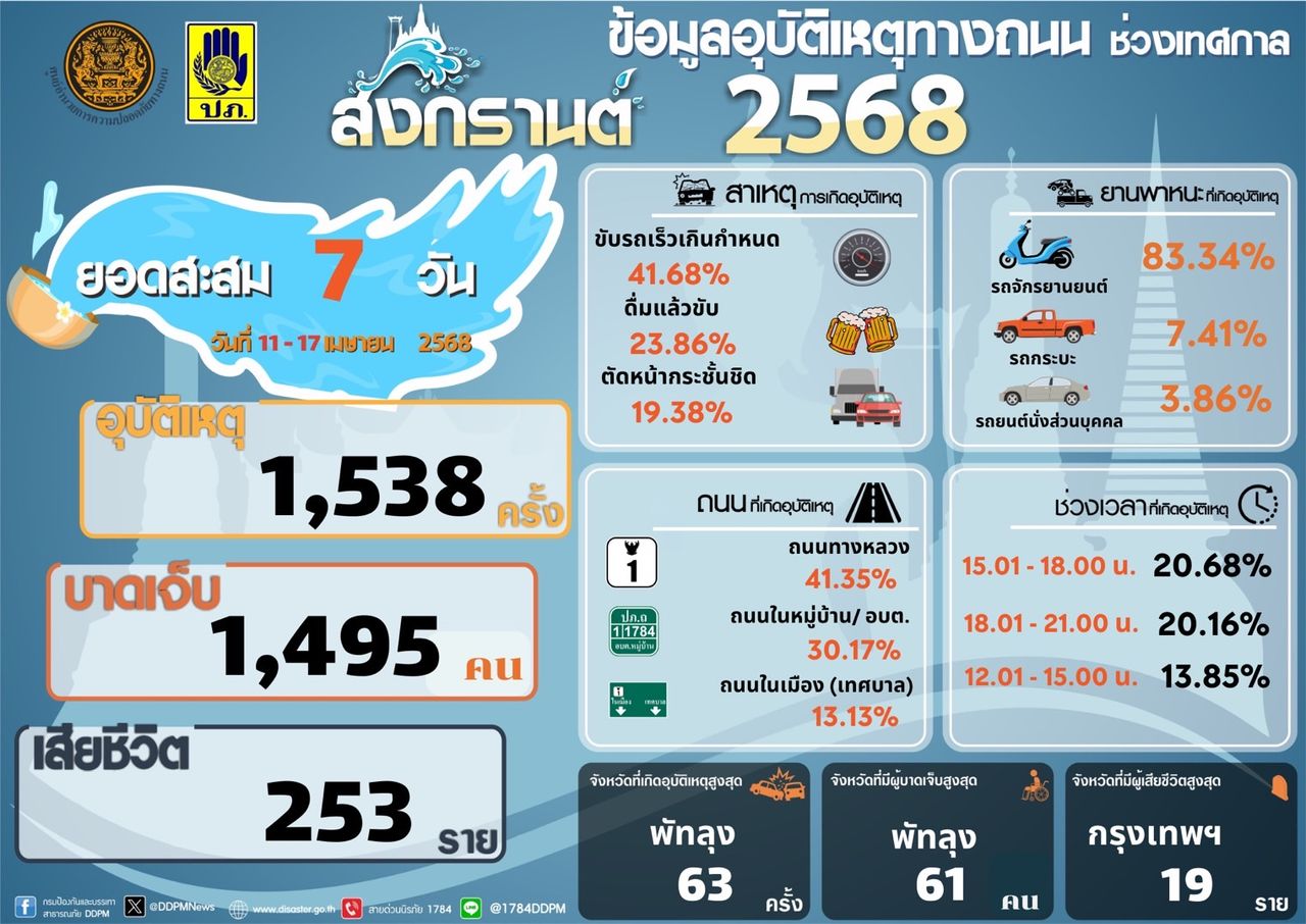 ปภ. รายงานสถิติช่วง 7 วันอันตรายเทศกาลสงกรานต์ประจำปี 2568 ภาพรวมอุบัติเหตุลดลง 25% “พัทลุง” มีอุบัติเหตุ-บาดเจ็บมากที่สุด “กทม.” ตายสูงสุด สาเหตุหลัก “ขับรถเร็ว-ดื่มแอลฯ”