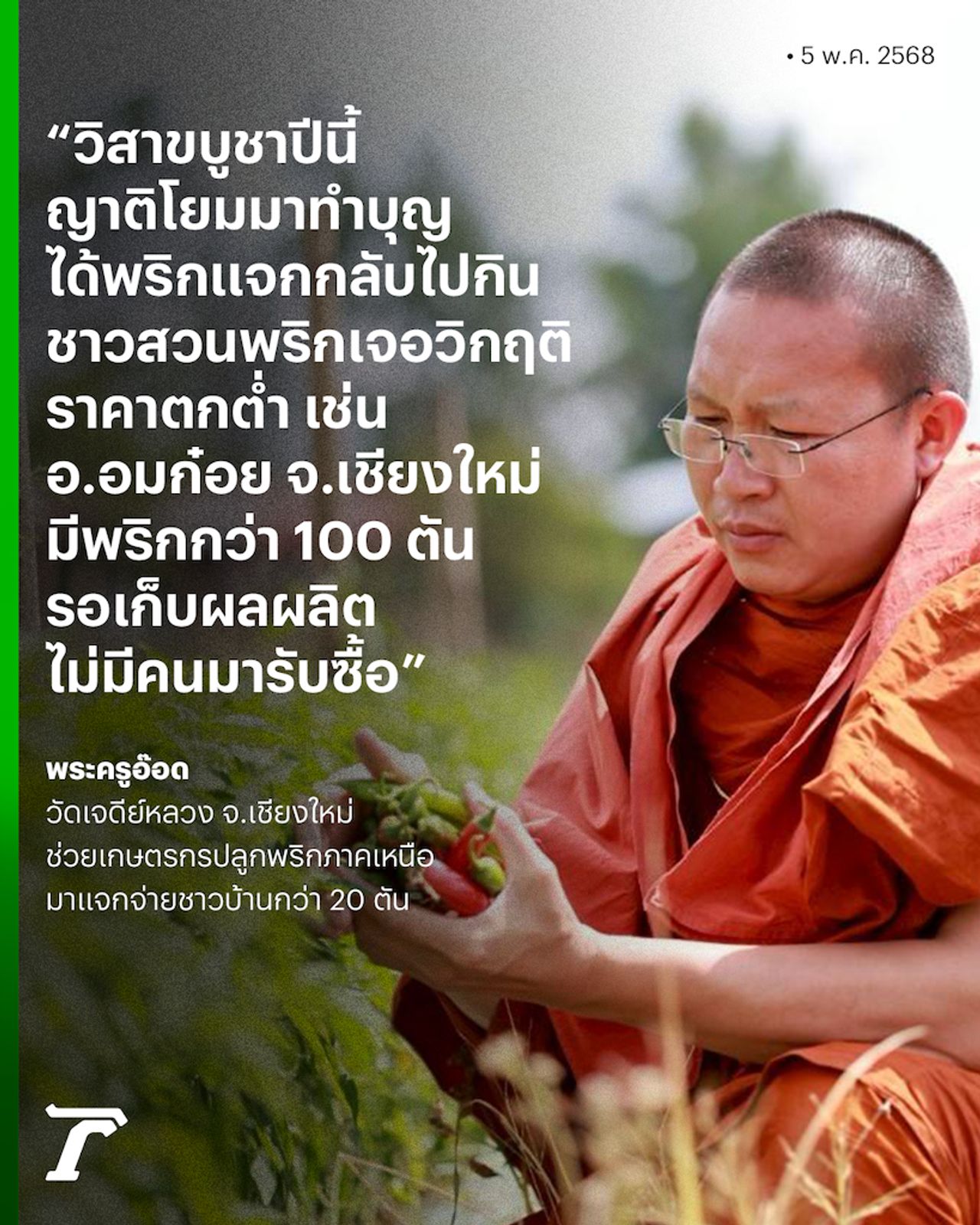 พริกราคาตก เกษตรกรภาคเหนือน้ำตาซึม ปล่อยยืนต้นตายเพียบ “พระครูอ๊อด” รับซื้อกว่า 20 ตัน เตรียมแจกพริกคนมาทำบุญวิสาขบูชา และงานประเพณีขึ้นดอยสุเทพ