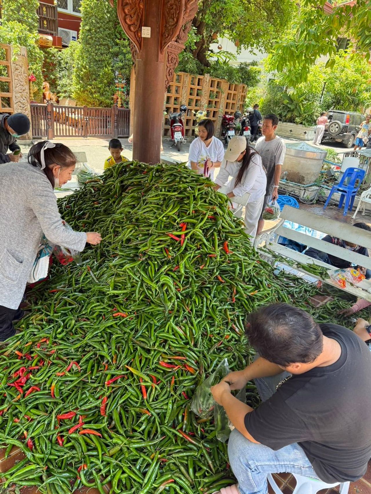 ตอนนี้มีพริกที่เกษตรกรจะมาให้รวมแล้วกว่า 20 ตัน โดยวันที่ 10 – 11 พ.ค.นี้ จะมาส่งที่วัด ประกอบกับวันที่ 10 พ.ค.นี้ มีประเพณีขึ้นดอยไหว้พระบรมธาตุดอยสุเทพ และวันที่ 11 พ.ค. นี้ เป็นวันวิสาขบูชา ชาวบ้านที่มาทำบุญจะได้พริกกลับไปรับประทาน ตอนนี้จากที่ถามชาวสวนพริก ยังมีผลผลิตอีกกว่า 100 ตัน รอเก็บเกี่ยวอยู่ในพื้นที่ อ.อมก๋อย จ.เชียงใหม่ ซึ่งยังไม่มีคนมารับซื้อ