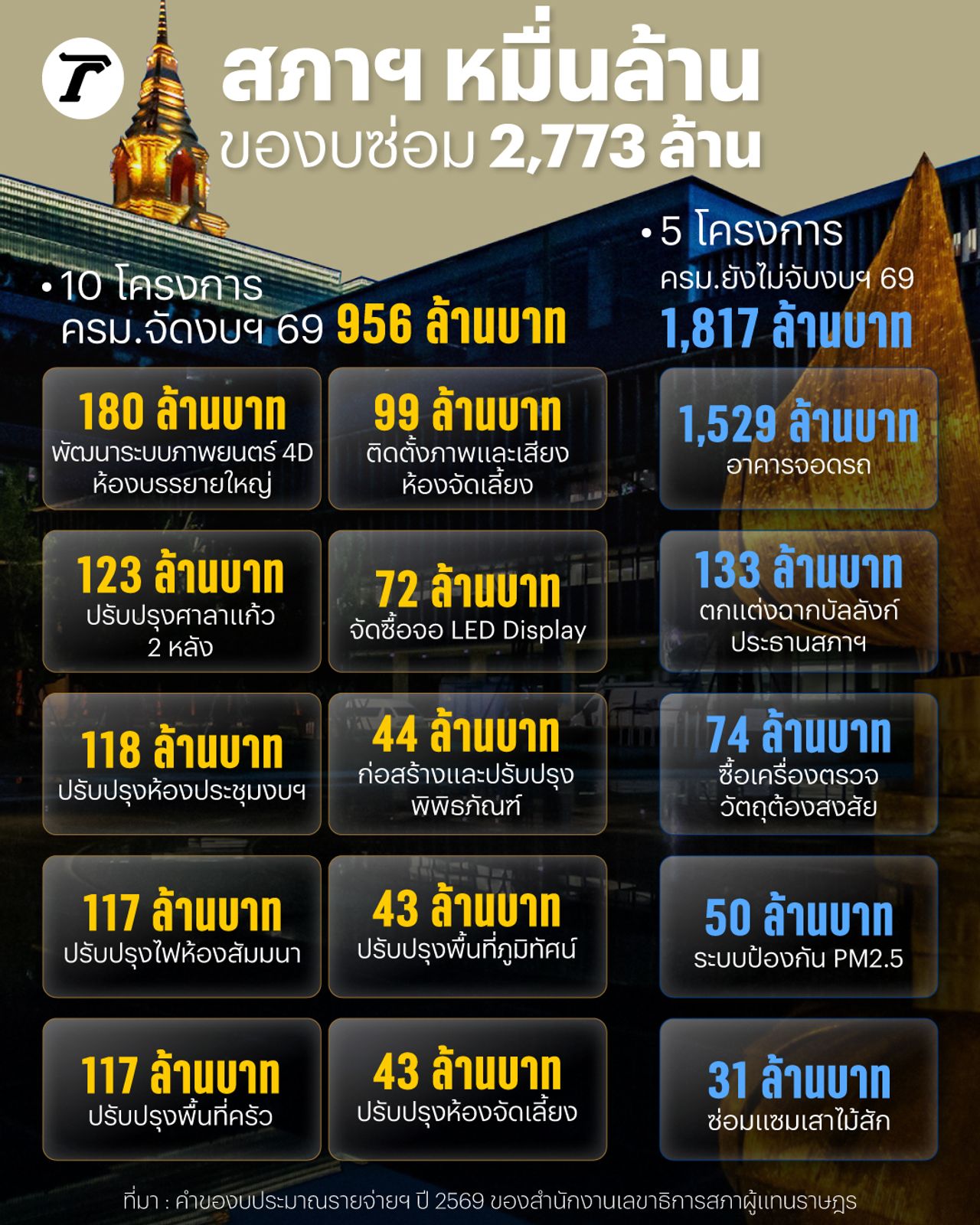 ล่าสุด นายพริษฐ์ วัชรสินธุ สส.พรรคประชาชน ในฐานะคณะกรรมาธิการการพัฒนาการเมือง การสื่อสารมวลชน และการมีส่วนร่วมของประชาชน สภาผู้แทนราษฎร โพสต์ผ่านเฟซบุ๊ก ตั้งคำถามถึงกรณีการของบประมาณฯ ปี 2569 ของรัฐสภา จำนวน 15 โครงการ รวมกว่า 2,773 ล้านบาท แบ่งเป็นดังนี้