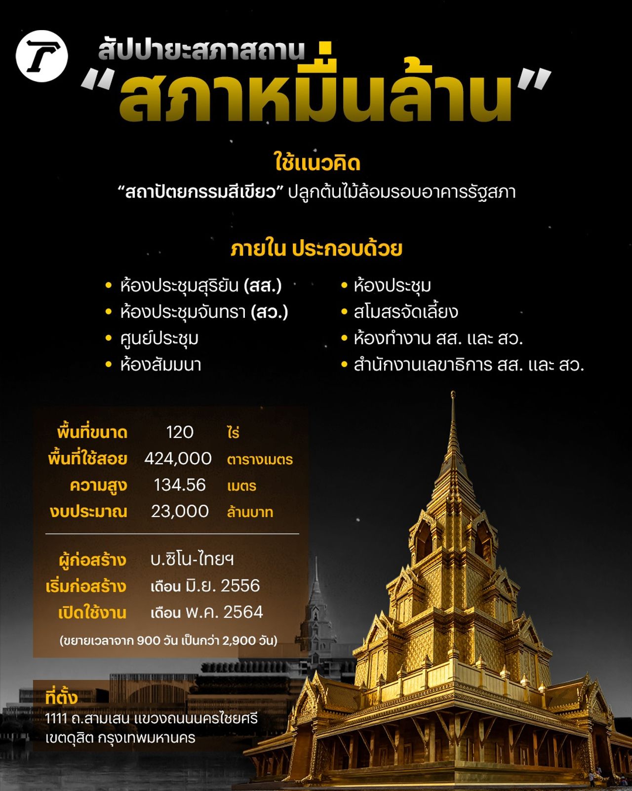 สัปปายะสภาสถาน อาคารรัฐสภาของประเทศไทย ได้ชื่อว่าเป็น “สภาหมื่นล้าน” ด้วยงบประมาณสร้างที่สูงมาก ส่งผลให้เป็นรัฐสภาที่มีพื้นที่ใช้สอยมากที่สุดในโลกถึง 424,000 ตารางเมตร และเป็นอาคารของรัฐบาลที่ใหญ่เป็นอันดับ 2 ของโลก เป็นรองเพียงแค่ อาคารเพนตากอน ของสหรัฐอเมริกาเท่านั้น
