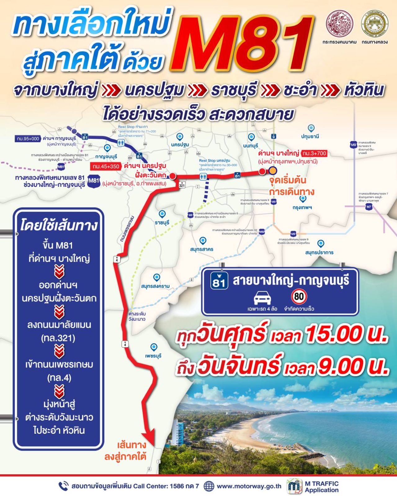 กรมทางหลวง กระทรวงคมนาคม เปิดให้ประชาชนผู้สนใจทดลองใช้เส้นทางมอเตอร์เวย์ M81 ช่วงบางใหญ่ - กาญจนบุรี เพื่อเดินทางลงสู่ภาคใต้และภาคตะวันตกอย่างสะดวกและรวดเร็ว ขณะนี้เปิดให้ประชาชนทดลองใช้บริการ ฟรี! ทุกวันศุกร์ เวลา 15.00 น. ถึงวันจันทร์ เวลา 09.00 น.