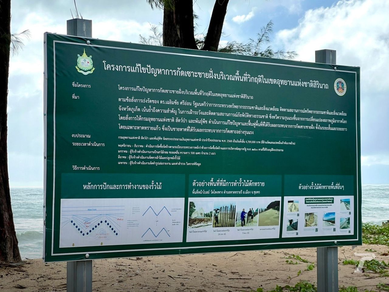 นายศิริวัฒน์ สืบสาย นักวิชาการป่าไม้ชำนาญการ หัวหน้าอุทยานแห่งชาติสิรินาถ กล่าวถึงความคืบหน้าโครงการแก้ไขปัญหาน้ำทะเลกัดเซาะชายฝั่งในพื้นที่ ใช้งบประมาณจากอุทยานแห่งชาติเมื่อปี 2567 ที่ผ่านมา เป็นเงิน 4,789,000 บาท เพื่อจัดทำรั้วไม้ดักทรายเป็นทางคู่ขนานในรูปแบบซิกแซก ความยาว 500 เมตรบนหาดทรายแก้ว เพื่อเป็นการดักกรองตะกอนทราย สร้างเนินทราย และป้องกันการกัดเซาะชายฝั่ง อีกทั้งเตรียมปลูกพันธุ์ไม้ชายหาดหลังแนวรั้วเพื่อสร้างเป็นกำแพงสีเขียว อาทิ ผักบุ้งทะเล หูกวาง เตยทะเล โดยในปัจจุบันดำเนินการไปแล้วกว่า 80% มีกำหนดแล้วเสร็จในช่วงเดือนสิงหาคมนี้