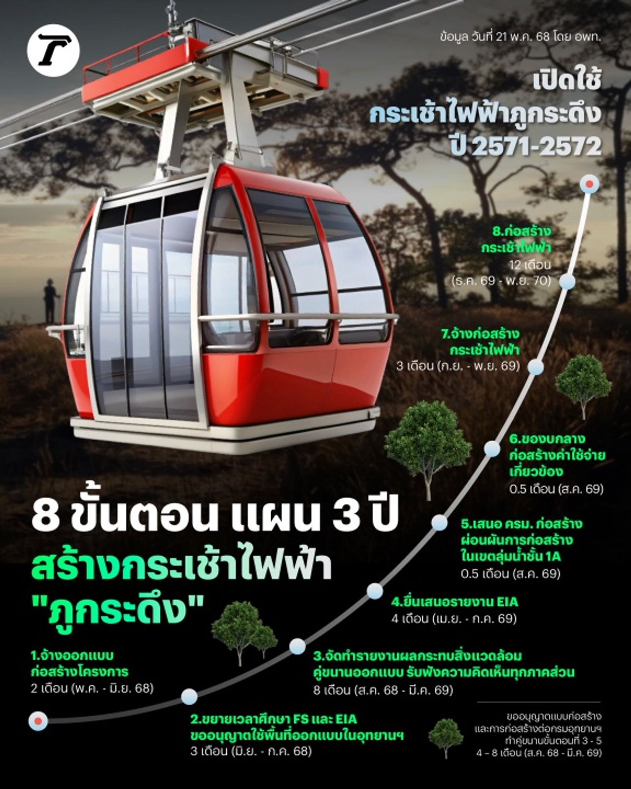 ระยะที่ 3 (ขั้นตอนที่ 7-8) ระยะเวลาการดำเนินงานโดยประมาณ 15 เดือน (กันยายน 2569 – พฤศจิกายน 2570) เข้าสู่ขั้นตอนของการก่อสร้างกระเช้าไฟฟ้าภูกระดึง โดยคาดว่าจะใช้ระยะเวลาในการก่อสร้างโดยประมาณ 12 เดือน.