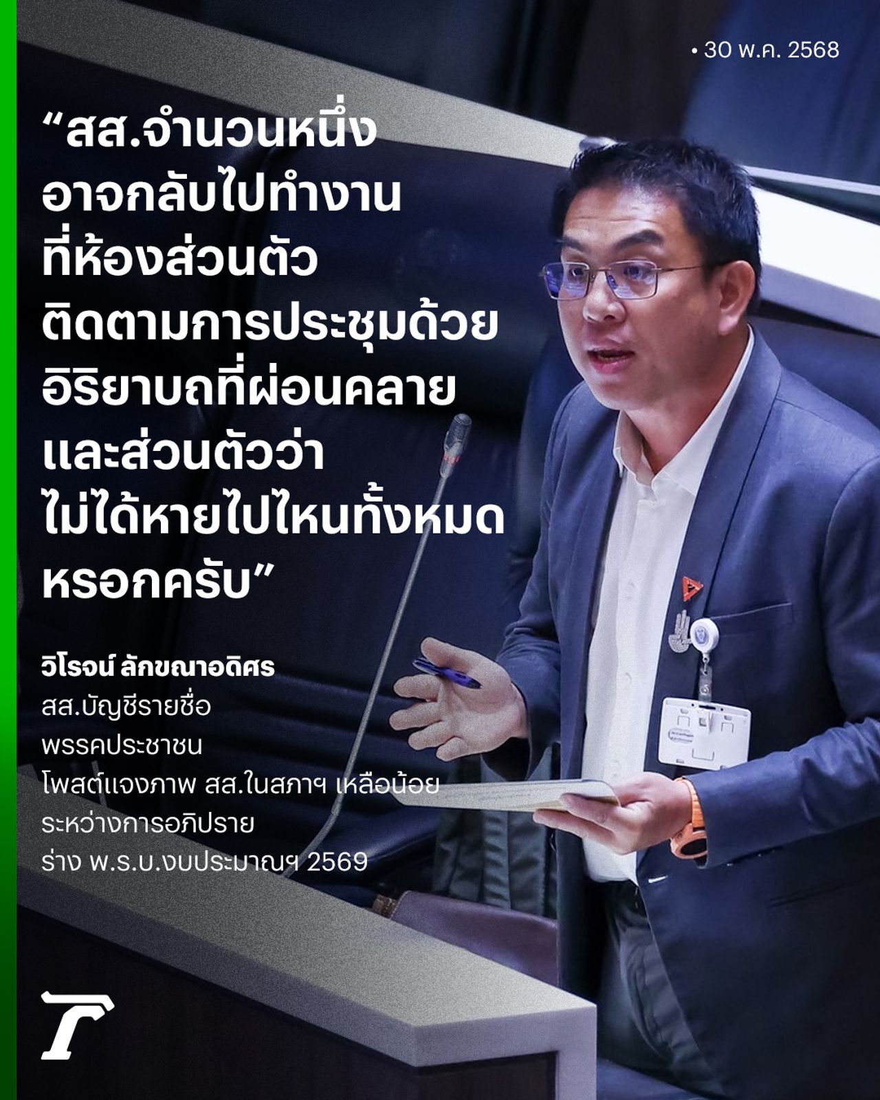 “สส. จำนวนหนึ่ง เขาอาจจะกลับไปทำงานที่ห้องส่วนตัวน่ะครับ หลายคนก็ติดตามการประชุมในอีกห้องหนึ่งด้วยอิริยาบถที่ผ่อนคลาย และมีความเป็นส่วนตัวมากกว่า อาจจะไม่ได้หายไปไหนทั้งหมดหรอกครับ