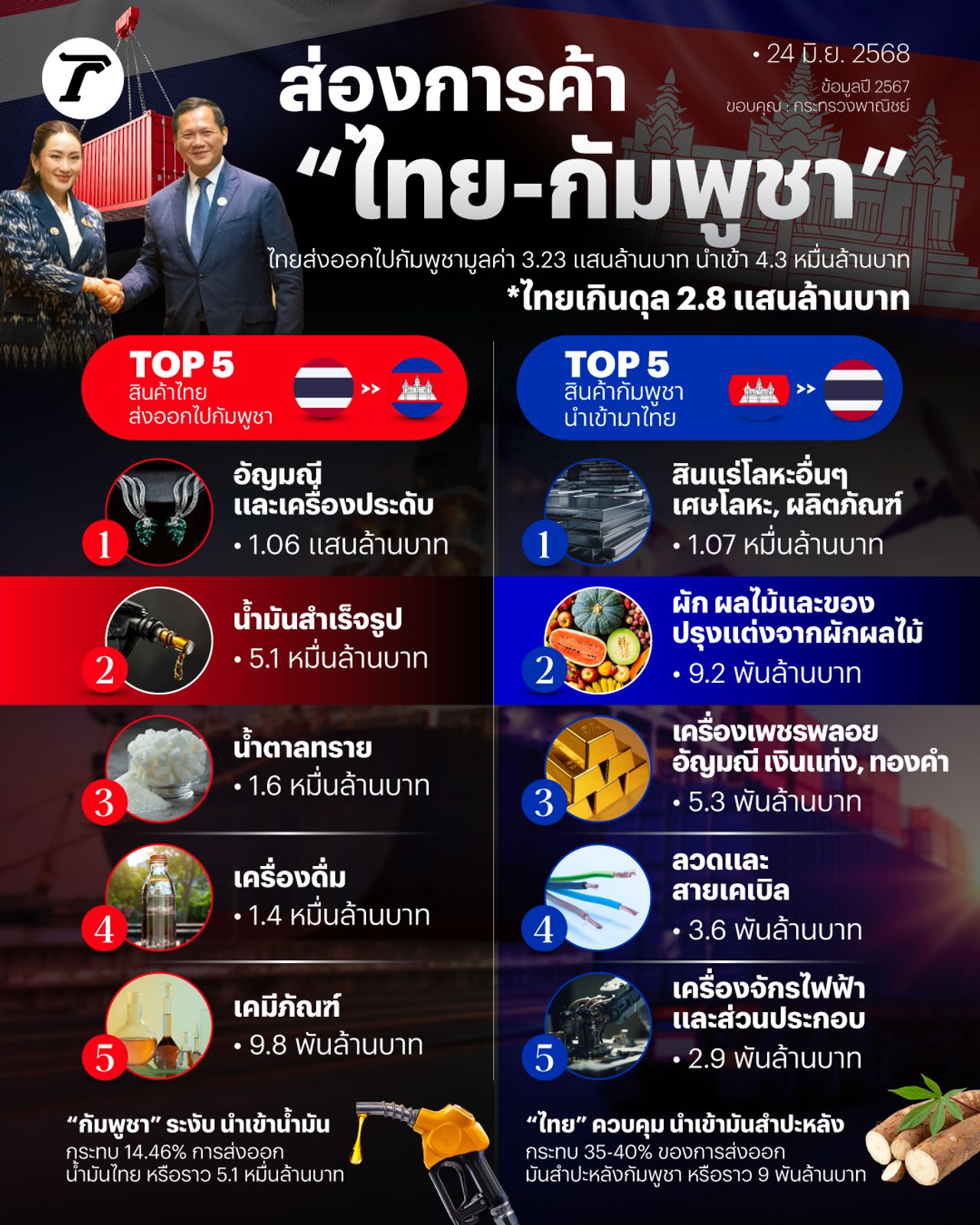 ข้อมูลจากศูนย์เทคโนโลยีสารสนเทศและการสื่อสาร สำนักงานปลัดกระทรวงพาณิชย์ พบว่า ในปี 2567 มูลค่าการค้าไทย-กัมพูชา อยู่ที่ 3.66 แสนล้านบาท โดยกัมพูชาเป็นตลาดส่งออกลำดับที่ 11 ของไทย มูลค่าการส่งออกที่ 3.23 แสนล้านบาท และในเดือน มกราคม-พฤษภาคม 2568 อยู่ลำดับที่ 9 ที่ 1.45 แสนล้านบาท ขณะที่การนำเข้าสินค้าปี 2567 กัมพูชาอยู่ลำดับที่ 27 มูลค่าการนำเข้า 4.3 หมื่นล้านบาท และในเดือน มกราคม-พฤษภาคม 2568 อยู่ลำดับที่ 26 ที่ 2.1 หมื่นล้านบาท กล่าวคือในปี 2567 ไทยเกินดุลการค้ากัมพูชาที่ 2.8 แสนล้านบาท