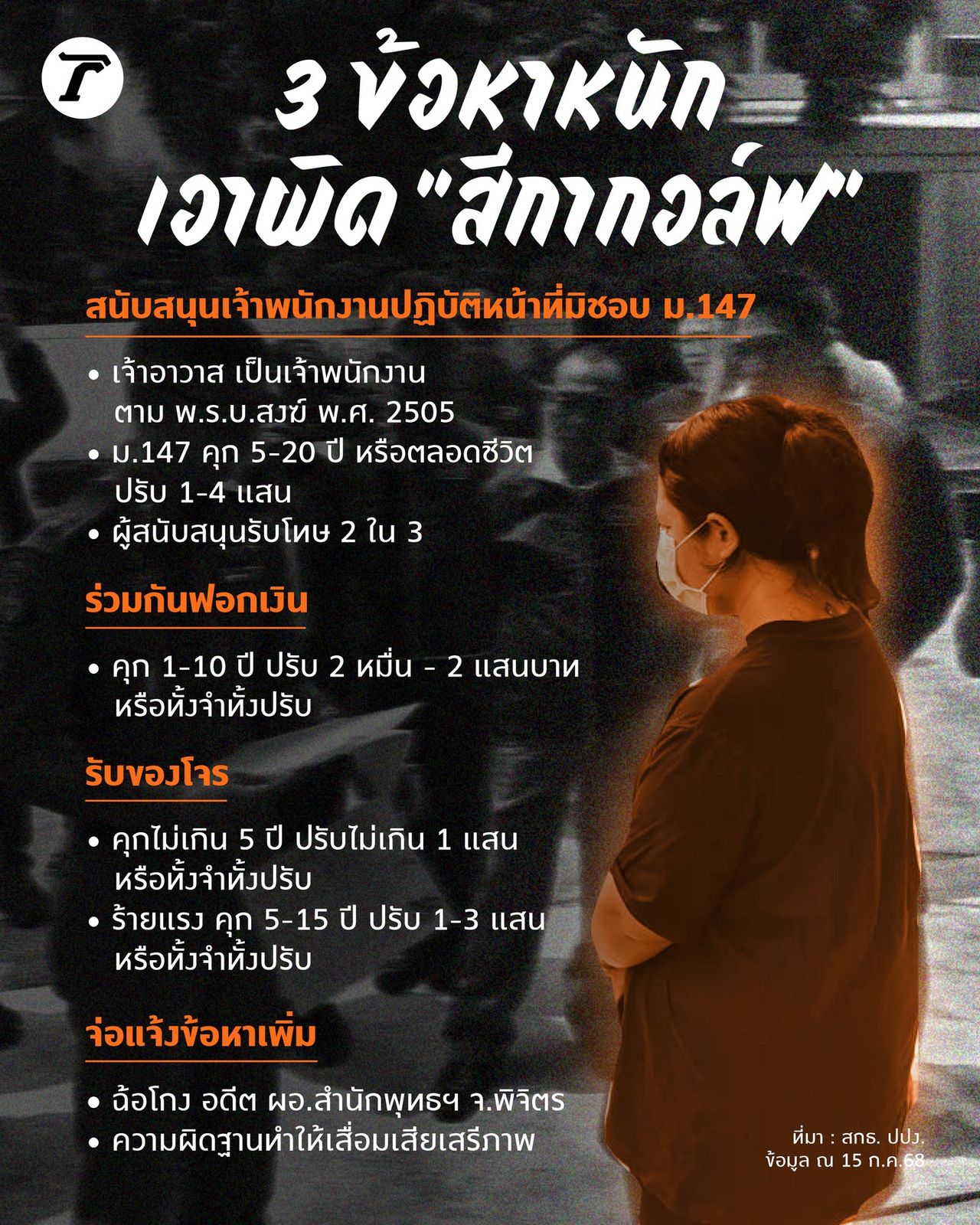 จากกรณี “สีกากอล์ฟ” ที่มีความสัมพันธ์กับพระชั้นผู้ใหญ่หลายรูป และพระบางรูปได้โอนเงินให้ทั้งจากบัญชีส่วนตัวและบัญชีวัด ว่าสุดวันนี้ (15 ก.ค.68) ศาลอาญาทุจริตและประพฤติมิชอบกลาง ได้อนุมัติออกหมายจับ น.ส.วิลาวัลย์ เอมสวัสดิ์ หรือ “สีกากอล์ฟ” ในข้อหาสนับสนุนเจ้าพนักงานปฏิบัติหน้าที่มิชอบ ม.147, ร่วมกันฟอกเงิน สมคบกันฟอกเงิน, รับของโจร หลังพบเส้นทางการเงินของอดีตพระเทพพัชราภรณ์ อดีตเจ้าอาวาสวัดชูจิตธรรมาราม จ.พระนครศรีอยุธยา โอนเงินจากบัญชีของวัดให้ 3.8 แสนบาท (อ่านต่อ: บุกจับ "สีกากอล์ฟ" ตามหมายจับ 3 ข้อหาหนัก คาบ้านพักหรูย่านนนทบุรี)