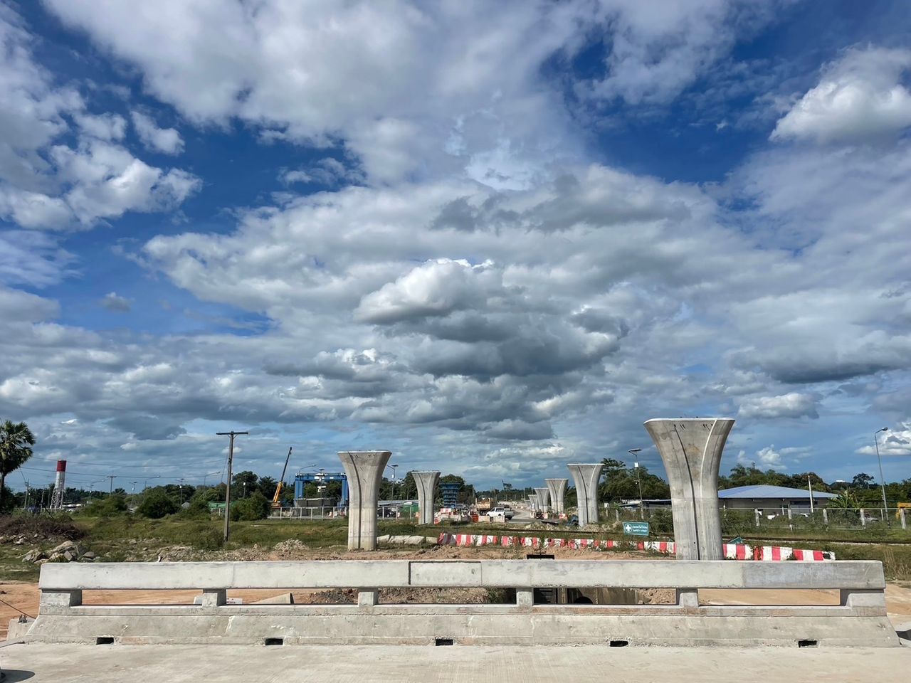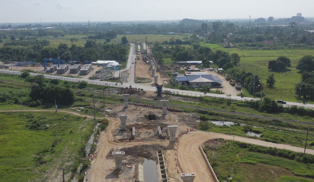 กำลังดำเนินการในส่วนของการก่อสร้างโครงสร้างเสาสะพานข้ามทางรถไฟ งานผิวจราจร งานรางระบบระบายน้ำ และงานคอนกรีตกันรถ