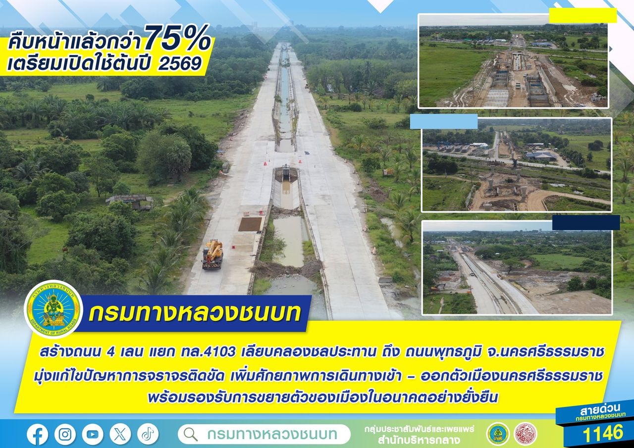การก่อสร้างถนน 4 เลน แยก ทล.4103 เลียบคลองชลประทาน ถึง ถนนพุทธภูมิ จ.นครศรีธรรมราช คืบหน้าแล้วกว่า 75% เตรียมเปิดใช้ต้นปี 2569 มุ่งแก้ไขปัญหาการจราจรติดขัด เพิ่มศักยภาพการเดินทางเข้า – ออกตัวเมืองนครศรีธรรมราช พร้อมรองรับการขยายตัวของเมืองนครศรีธรรมราชในอนาคต