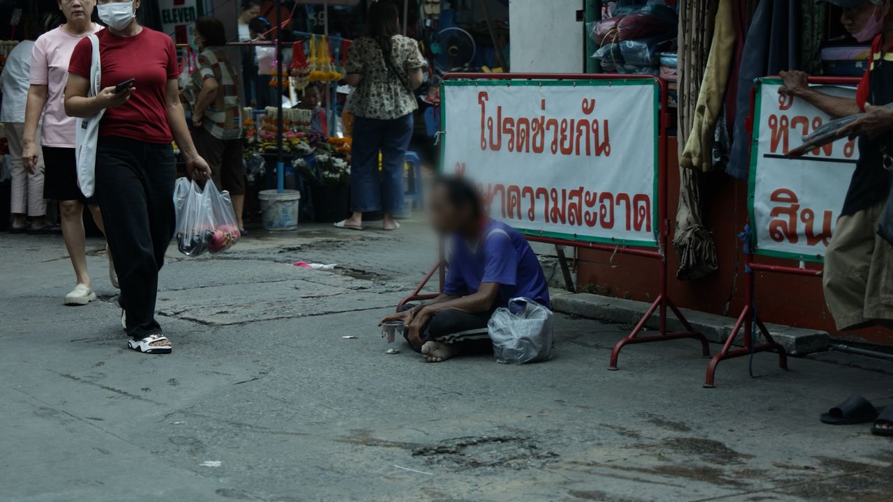 เช่นเดียวกับถนนสุขุมวิท ถนนเส้นนี้ถือเป็นเส้นเลือดใหญ่ของกลุ่มขอทานในกรุงเทพฯ เราพบหญิงกัมพูชาคนหนึ่งนั่งขอทานหน้าห้างสรรพสินค้า เธออุ้มหลานอยู่ในอ้อมกอด ถัดจากจุดที่เธอนั่ง มีเด็กหญิงอีกคนกำลังนั่งขอทานเรียกร้องความสงสาร เมื่อเข้าไปสอบถาม จึงรู้ว่าเด็กคนนี้คือหลานอีกคนของเธอ