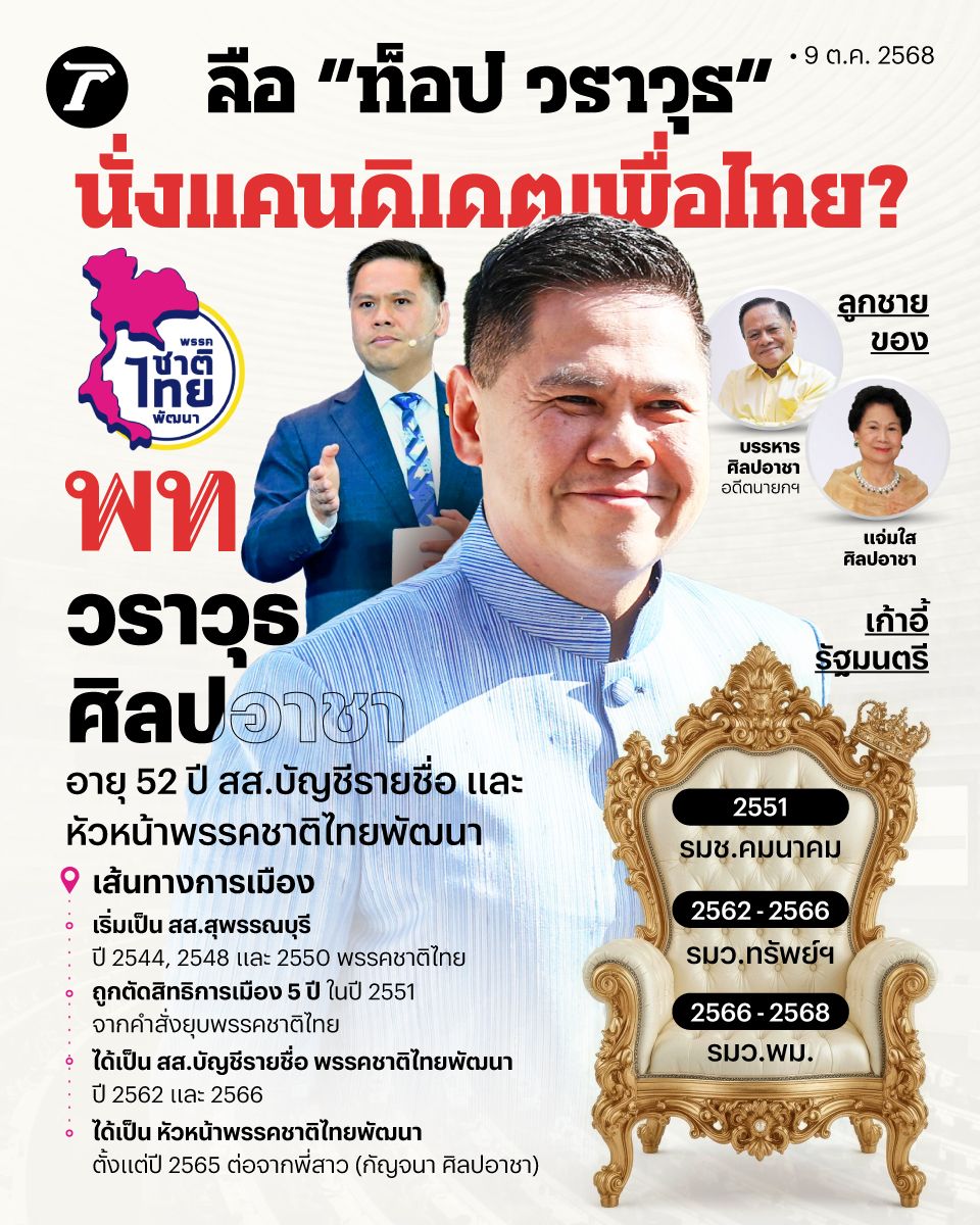 วันที่ 8 ต.ค.68 รศ.ดร. ธนพร ศรียากูล ผู้อำนวยการสถาบันวิเคราะห์การเมืองและนโยบาย ให้สัมภาษณ์ในรายการเจาะลึกทั่วไทย ทางช่อง 9 ว่า ตอนนี้พรรคเพื่อไทยกำลังต้องการนายวราวุธ ศิลปอาชา และอาจเป็นทีเด็ดของพรรค ซึ่งขณะนี้กำลังมีการพูดคุยกันอยู่ และอาจย้ายมาเป็น สส.ปาร์ตี้ลิสต์ของพรรคเพื่อไทยลำดับต้นๆ หรืออาจถึงขั้นเป็น 1 ในแคนดิเดตนายกฯ
