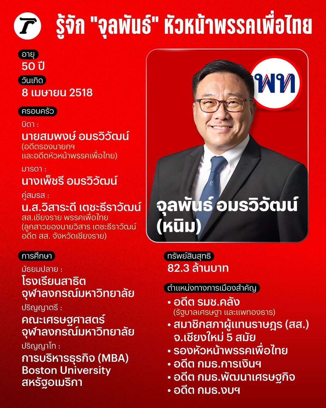 ที่ประชุมพรรคเพื่อไทยมีมติเลือกนายจุลพันธ์ อมรวิวัฒน์ วัย 50 ปี สส.เชียงใหม่ 5 สมัยซ้อน อดีต รมช.คลัง ยุคนายกฯ เศรษฐา-แพทองธาร นั่งหัวหน้าพรรคคนใหม่ด้วยเสียงอย่างท้วมท้น เตรียมนำพรรคสู้ศึกเลือกตั้งใหญ่ ต้นปี 2569