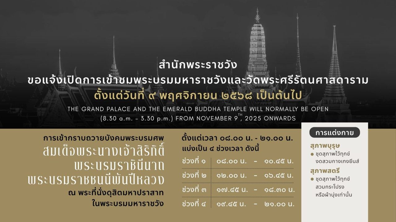 สำนักพระราชวัง ขอแจ้งเส้นทางเข้ากราบถวายบังคมพระบรมศพ สมเด็จพระนางเจ้าสิริกิติ์ พระบรมราชินีนาถ พระบรมราชชนนีพันปีหลวง ณ พระที่นั่งดุสิตมหาปราสาท ในพระบรมมหาราชวัง และเส้นทางเดินเยี่ยมชม สำหรับนักท่องเที่ยว ตั้งแต่วันที่ 9 พฤศจิกายน 2568 เป็นต้นไป