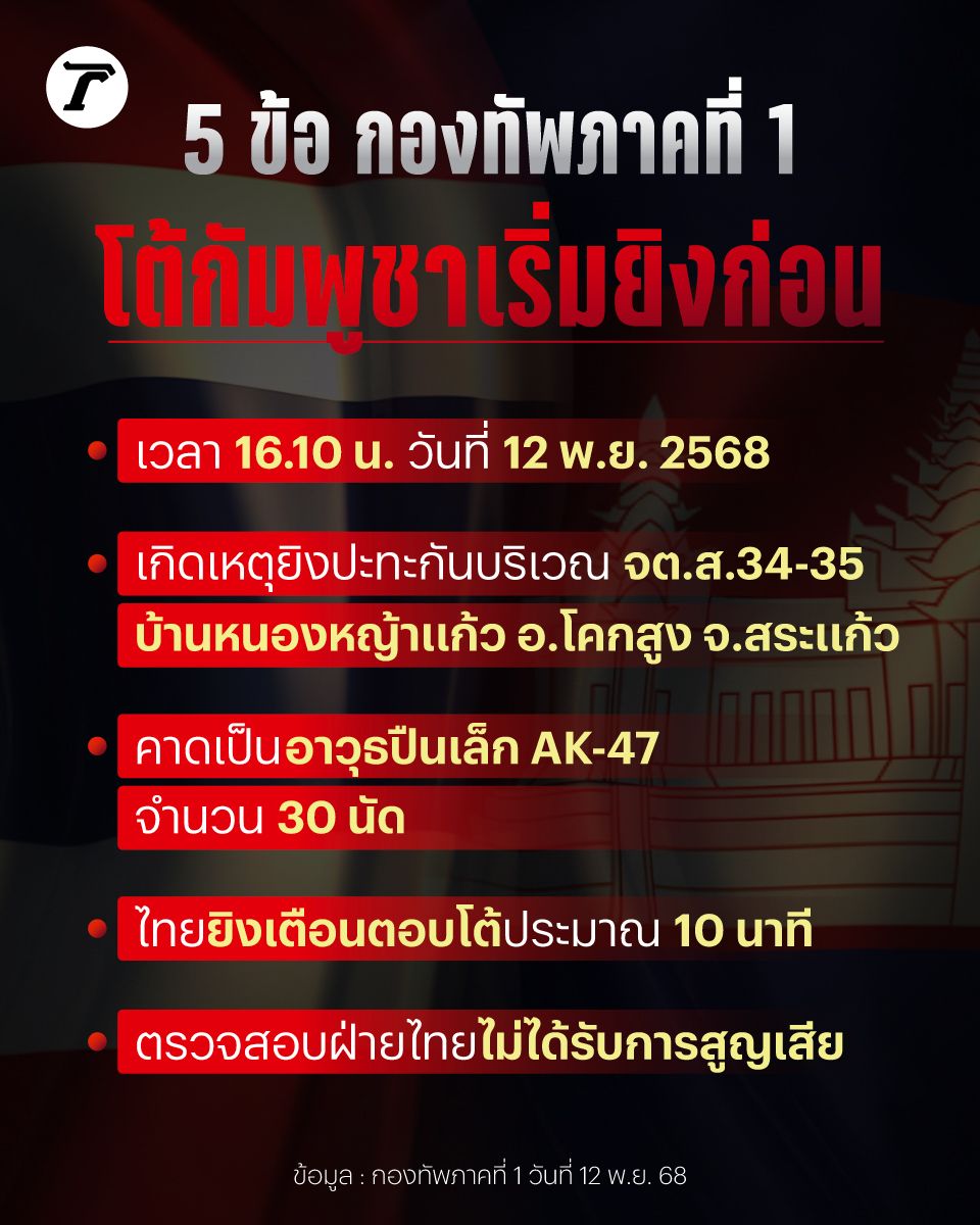 5 ข้อ กองทัพภาคที่ 1 โต้กัมพูชาเริ่มยิงก่อน คาดใช้อาวุธปืนเล็ก AK-47 ยิงมาฝั่งบ้านหนองหญ้าแก้ว อ.โคกสูง จ.สระแก้ว ประมาณ 30 นัด ก่อนไทยยิงเตือนโต้กลับ