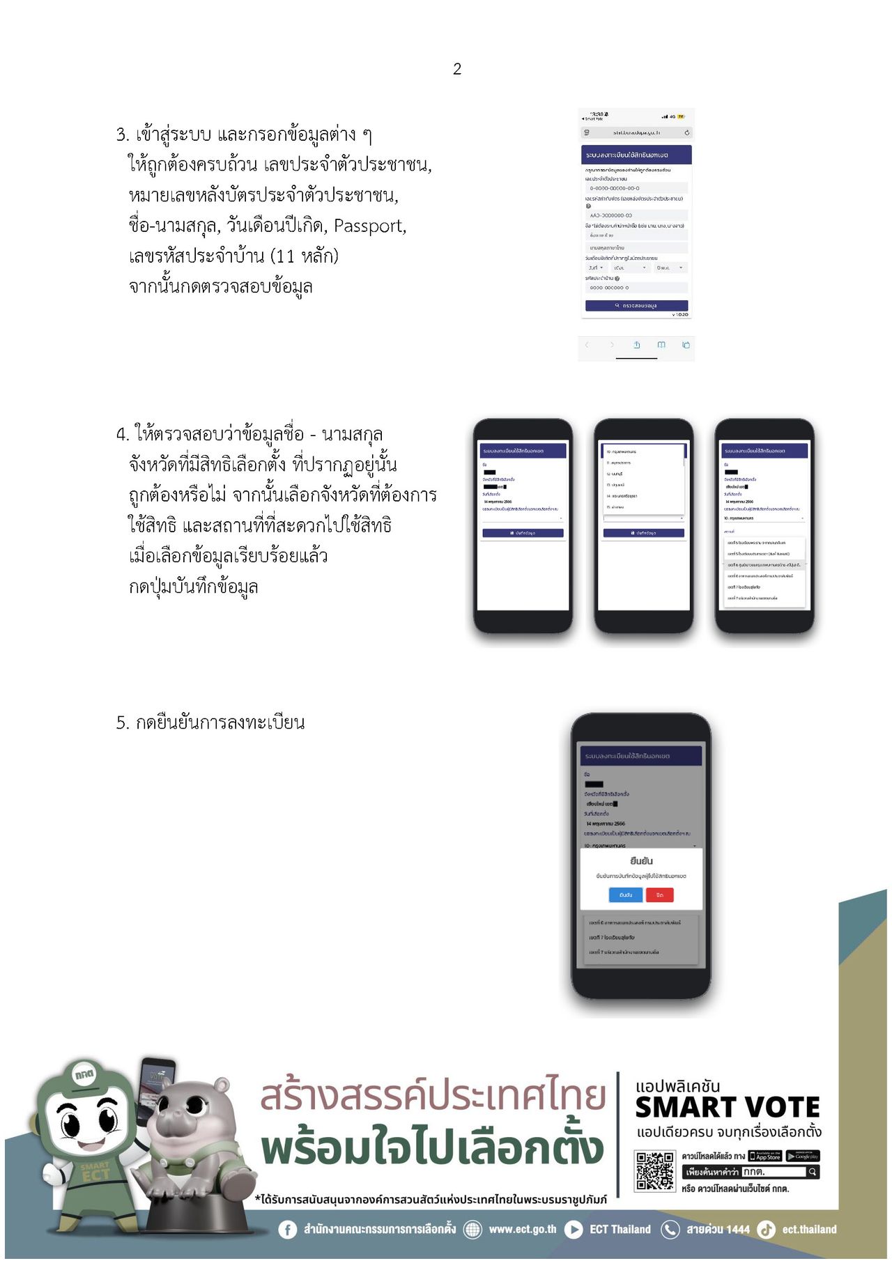 โดยการลงทะเบียนขอใช้สิทธิ์เลือกตั้งล่วงหน้าสามารถดำเนินการผ่านแอพพลิเคชั่น Smart vote ได้ตลอด 24 ชั่วโมง และไม่ต้องนำส่งเอกสารและหลักฐานประกอบการลงทะเบียน https://play.google.com/store/apps/details?id=com.smartvote&hl=th ซึ่งมีขั้นตอนดังนี้