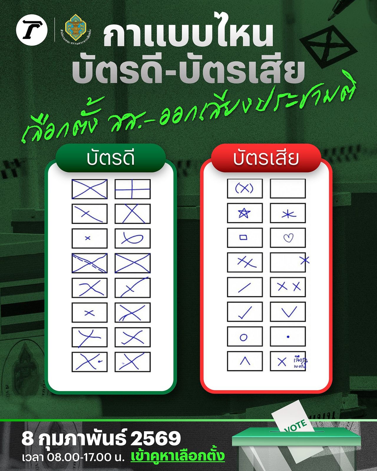 แต่!! สำหรับการเลือกตั้งในวันที่ 8 กุมภาฯ การทำเครื่องหมาย X บนบัตรลงคะแนนทั้งสามใบ ทั้งสามสี จะไม่ฟรีสไตล์ เหมือนข้อความหรือจดหมายรักในวันวาเลนไทน์ เพราะในการกากบาทบนกระดาษลงคะแนนนั้น คณะกรรมการการเลือกตั้ง หรือ กกต. ระบุรูปแบบชัดเจน ว่า ควร และ ไม่ควร ทำเครื่องหมาย X แบบไหนบนบัตรลงคะแนน