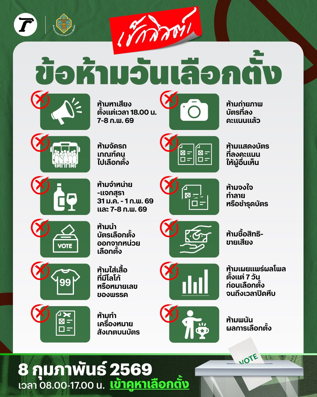 การเลือกตั้ง สมาชิกสภาผู้แทนราษฎร หรือ สส. วันอาทิตย์ ที่ 8 กุมภาพันธ์ 2569 นี้ มีข้อห้ามที่ประชาชนต้องรับทราบไว้ จะได้ไม่ทำผิดกฎหมาย ดังต่อไปนี้