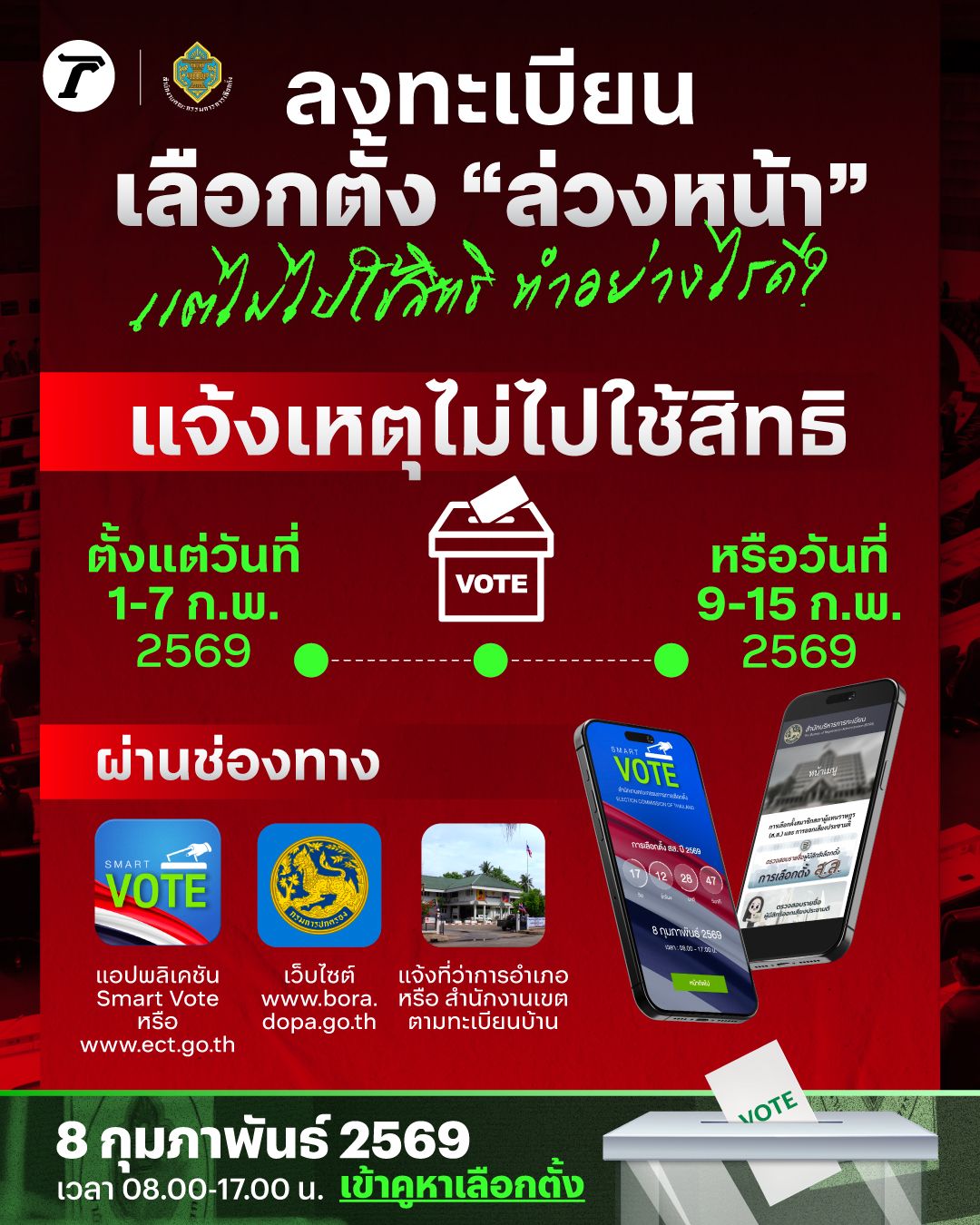 คำถามยอดนิยมคือ... คนที่พลาด (หรือกำลังจะพลาด) การเลือกตั้งล่วงหน้า 1 กุมภาพันธ์ กลับไปเลือกตั้งวันที่ 8 กุมภาพันธ์ 2569 เหมือนคนส่วนใหญ่ได้ไหม คำตอบคือไม่ได้!!