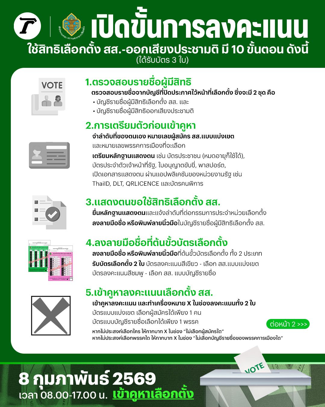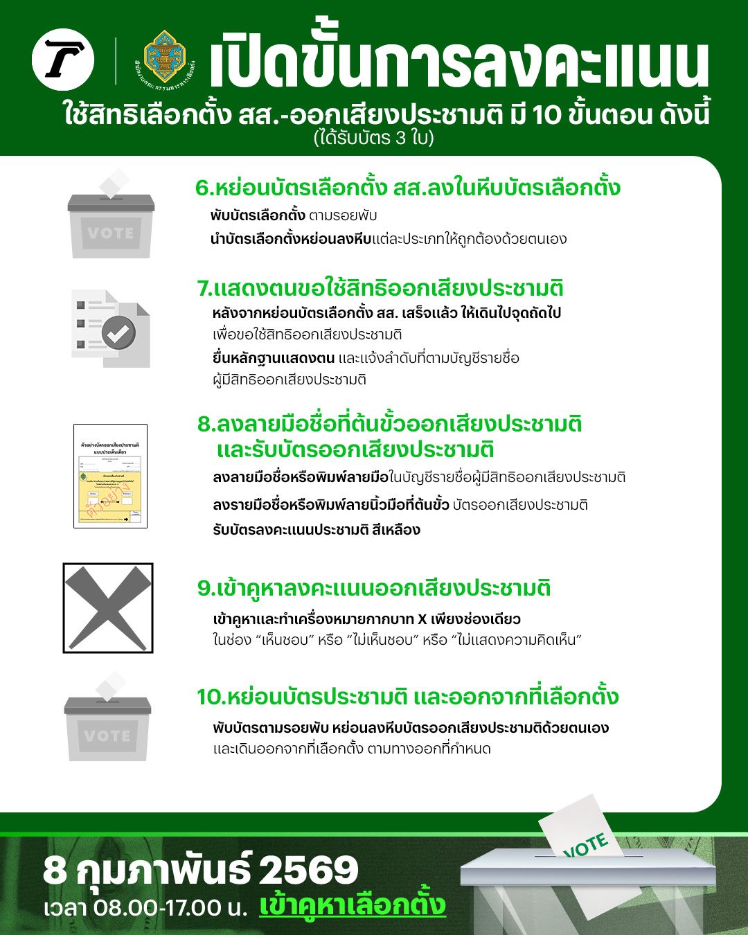 ขั้นตอนการลงคะแนนเสียงเลือกตั้ง สส.แบบเขต (บัตรสีเขียว) บัญชีรายชื่อ (บัตรสีชมพู) และการลงประชามติแก้รัฐธรรมนูญปี 2560 (บัตรสีเหลือง) ในวันอาทิตย์ที่ 8 กุมภาพันธ์ 2569 เวลา 08.00 – 17.00 น. ณ หน่วยเลือกตั้งที่ผู้มีสิทธิเลือกตั้ง มีชื่อตามทะเบียนบ้าน