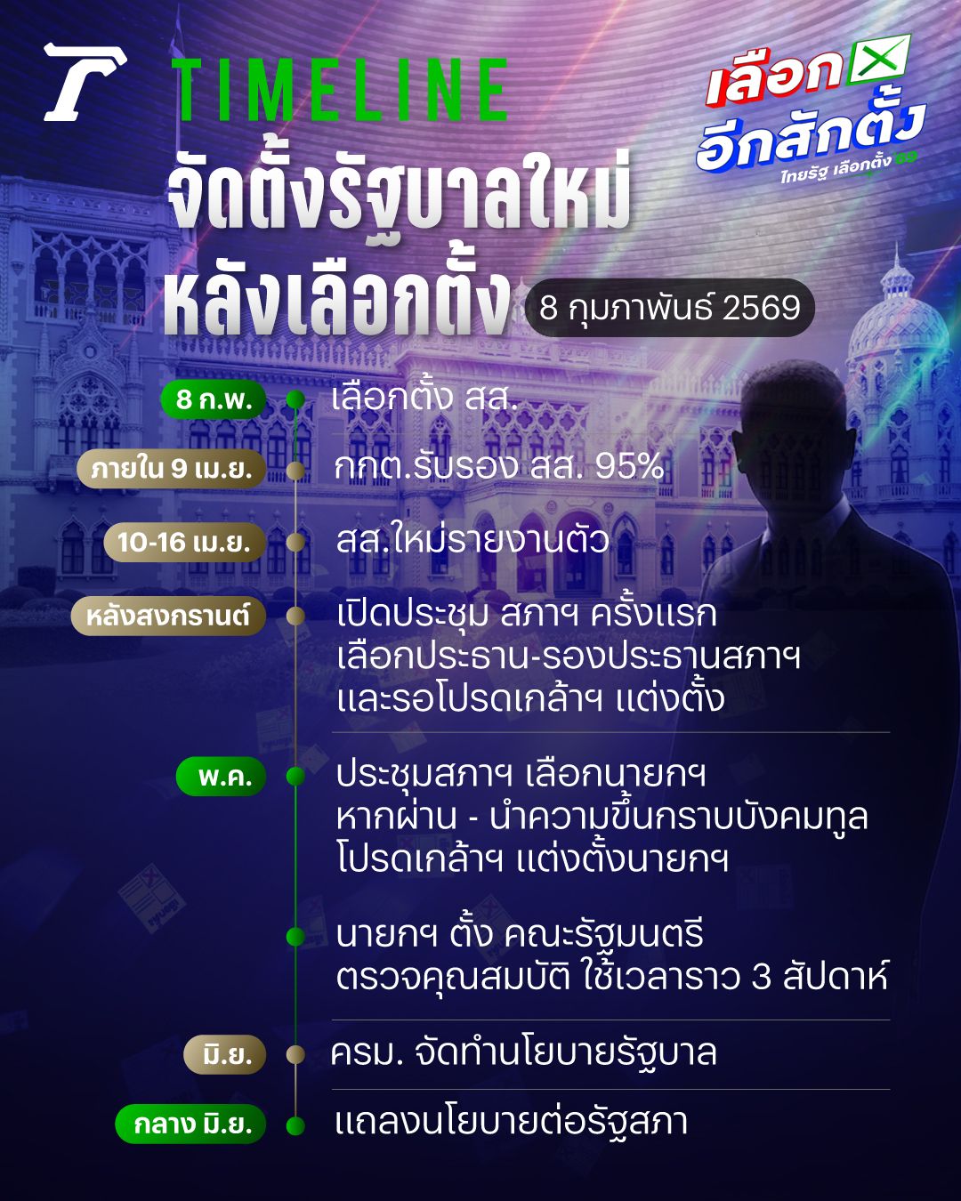 โดยไทม์ไลน์การจัดตั้งรัฐบาลใหม่ หลังเลือกตั้ง 8 ก.พ.69 มีดังนี้