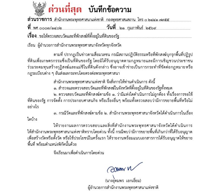 จดหมายด่วนที่ส่งให้กับสำนักพุทธศาสนา ทั่วประเทศมีเนื้อหาดังนี้