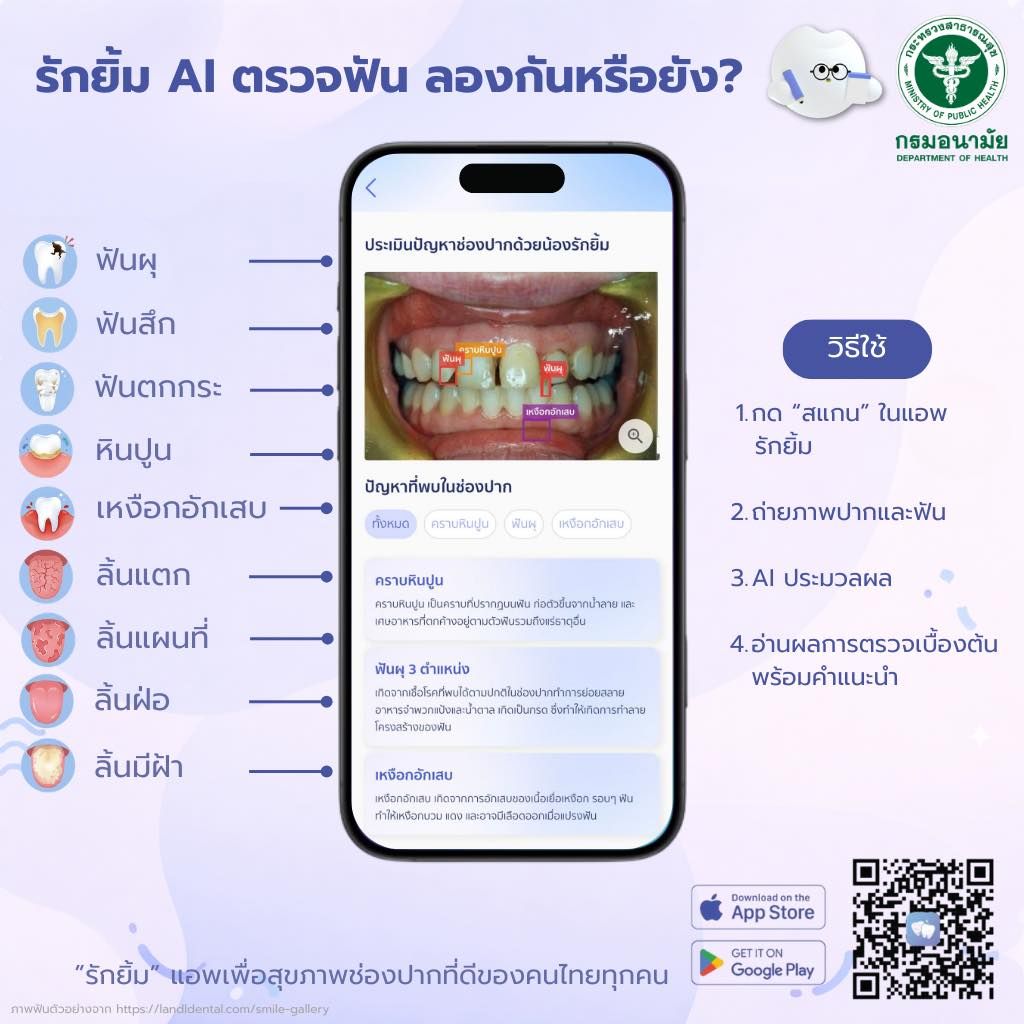 ตรวจฟันฟรี กรมอนามัย เปิดเช็ก 11 สภาวะในช่องปากด้วย AI ผ่านมือถือง่ายเพียงปลายนิ้ว ด้วยแอพ “รักยิ้ม” พร้อมแล้วลองคลิกด้วยได้ทันที