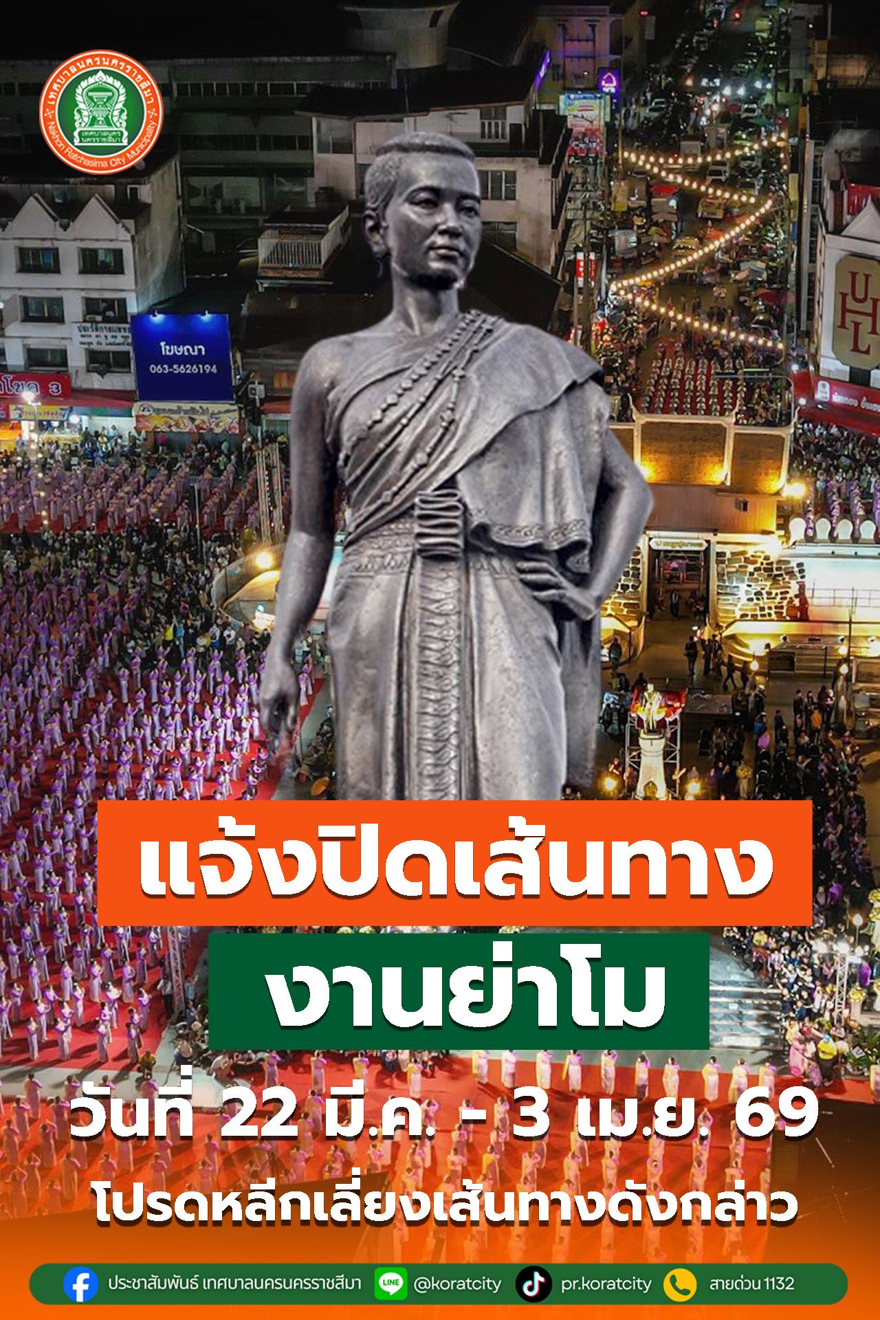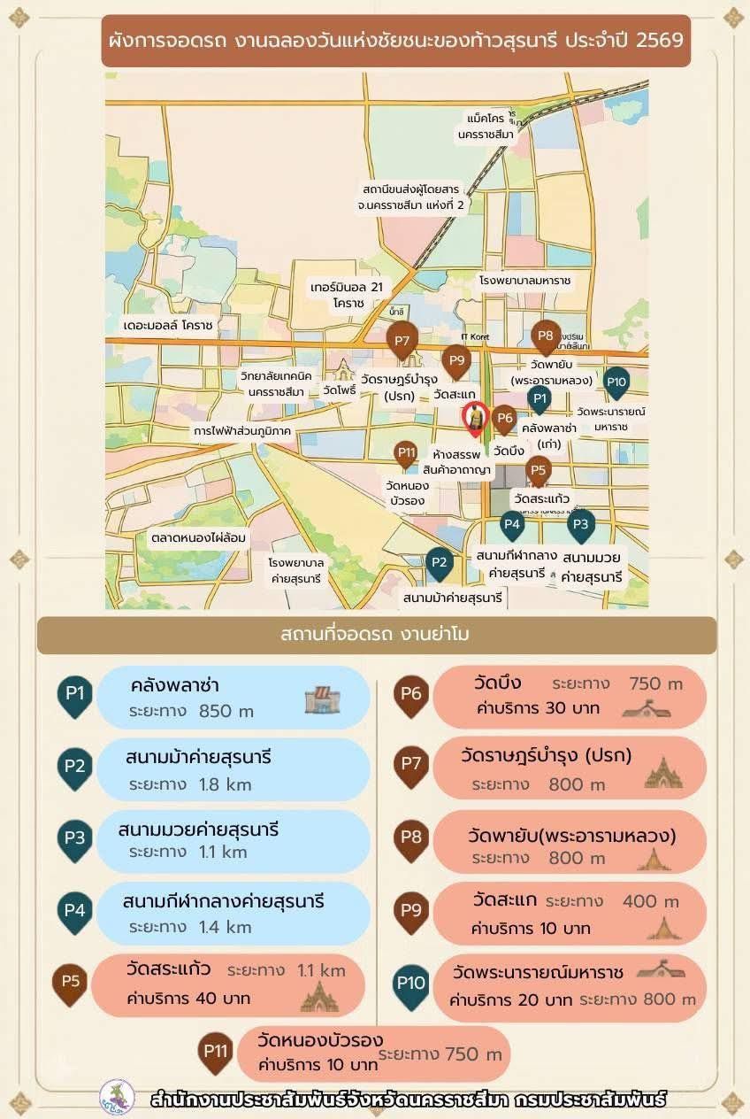 🎡 กิจกรรมที่มี "ทุกวัน" ตลอดงานหากคุณไปเที่ยวชมงานในช่วงวันที่ 23 มี.ค. - 3 เม.ย. คุณจะได้พบกับ:การสักการะย่าโม: ประชาชนหลั่งไหลมาปิดทองและกราบไหว้ขอพรร้านมัจฉากาชาด: ลุ้นโชคชิงรางวัลใหญ่ (รถยนต์, มอเตอร์ไซค์, เครื่องใช้ไฟฟ้า) ตลาดสินค้า OTOP: ของดีจากทุกอำเภอในโคราช เช่น ผ้าไหมปักธงชัย, คั่วหมี่โคราช, เครื่องปั้นดินเผาด่านเกวียนมหรสพพื้นบ้าน: ลิเก, หนังกลางแปลง, และการละเล่นเพลงโคราช (ที่เป็นเอกลักษณ์เฉพาะตัว)