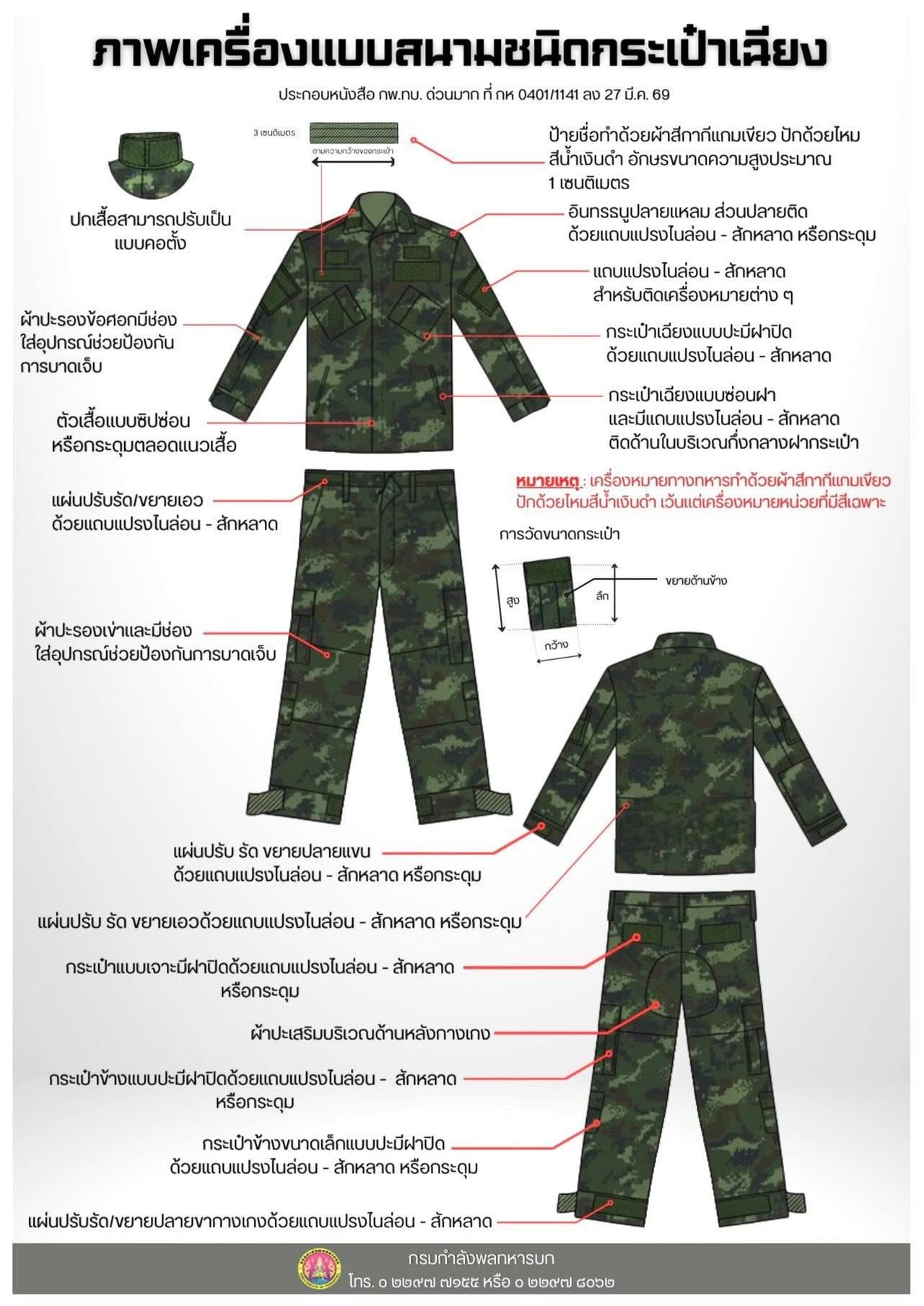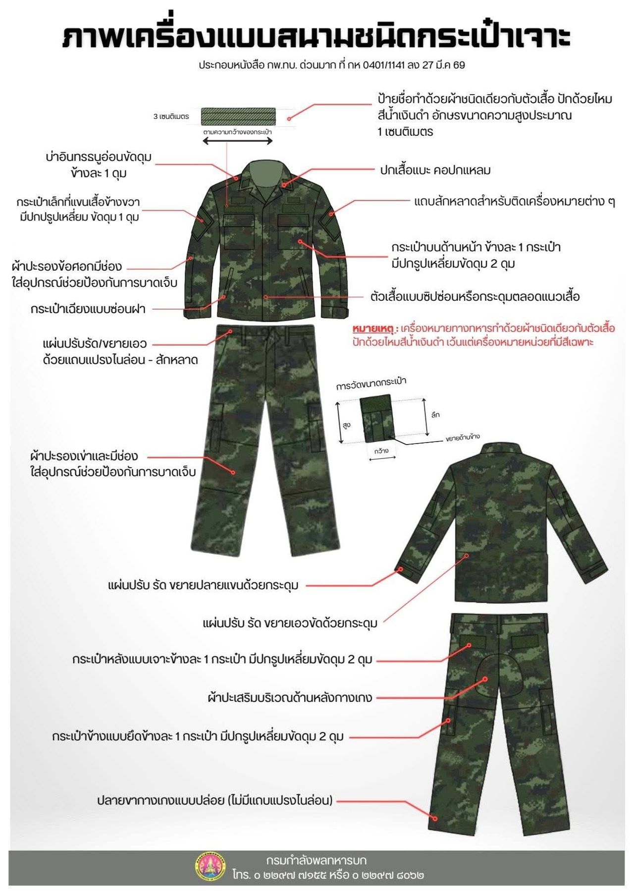 กองทัพบก ปรับแนวทางเครื่องแบบสนาน ความแตกต่างกระเป๋าเฉียง-กระเป๋าเจาะ เพื่อให้สอดคล้องกับลักษณะการปฏิบัติการทางทหารในปัจจุบันที่มีความหลากหลายและต้องการความคล่องตัวสูง ผู้บัญชาการทหารบก จึงได้อนุมัติแนวทางให้กำลังพลสามารถเลือกใช้เครื่องแบบสนามได้ทั้ง "แบบกระเป๋าเจาะ" และ "แบบกระเป๋าเฉียง" โดยพิจารณาตามความเหมาะสมของภารกิจ พื้นที่ และสภาพแวดล้อมในการปฏิบัติงานเป็นหลัก