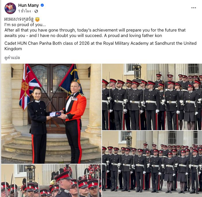วันนี้ 10 เม.ย.69 ฮุน มานี ทายาทของอดีตผู้นำกัมพูชา โพสต์ไว้ในเพจส่วนตัวว่า “พ่อภูมิใจในตัวลูกมาก… หลังจากที่ลูกผ่านอะไรมามากมาย ความสำเร็จในวันนี้จะเตรียมลูกให้พร้อมสำหรับอนาคตที่รออยู่ข้างหน้า และพ่อก็ไม่สงสัยเลยว่าลูกจะประสบความสำเร็จ พ่อผู้ภาคภูมิใจและรักลูกมาก” นักเรียนนายร้อย โรงเรียนนายร้อยทหารบกแซนด์เฮิสต์ (Royal Military Academy Sandhurst - RMAS) ประเทศอังกฤษ