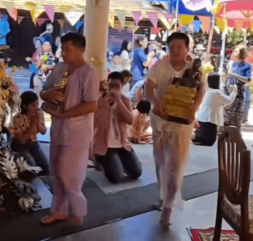 ถ้าเห็นในคลิปขบวนอัญเชิญจะมีอยู่ 3 คนที่อุ้มพระพุทธรูปกลับไปประดิษฐานบนศาลา โดยคนเดินนำหน้าเป็นคนอุ้มพระแก้วองค์จริง คนกลางอุ้มพระพุทธรูปที่บางครั้งเรียกว่าพระพี่เลี้ยง เป็นพระพุทธรูปบุทองคำ ฐานเงินเป็นพระโบราณที่จะนำไว้หลังพระแก้วดอนเต้า ตลอดมา ส่วนคนที่ 3 อุ้มพระพุทธรูปที่ประสบอุบัติเหตุหล่นแตก ที่นำมาสรงน้ำด้วยเพื่อให้ประชาชนได้ปิดทอง ป้องกันการเสียหายขององค์จริง โดยการปิดทองจะให้องค์จริงวางเป็นประธาน แต่ไม่ให้ประชาชนทั่วไปปิดทอง ซึ่งจะให้ปิดทองเฉพาะองค์ที่สร้างใหม่